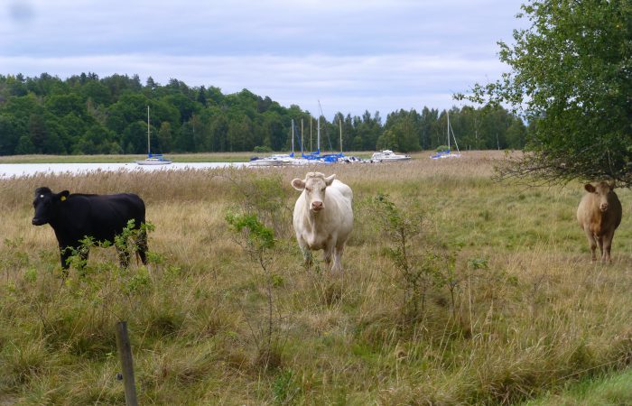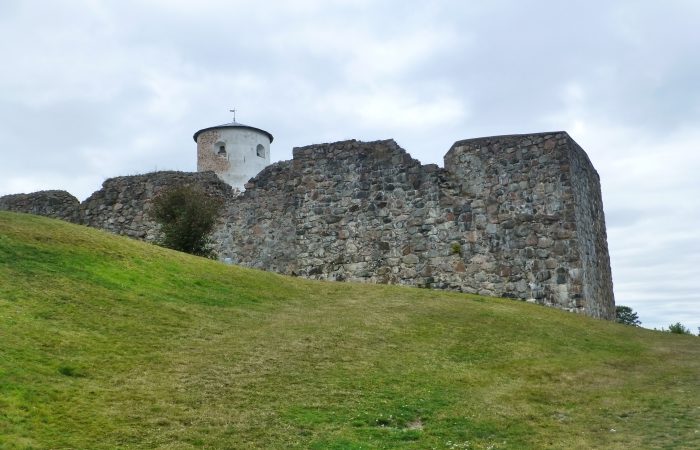 weite flache Felder mit Getreide, ab und zu auch Vieh auf der Weide, und natürlich unzählige Buchten mit kleinen Häfen. Die Stägeborg Ruine steht beim hier schmalen Fahrwasser des Slätbaken Fjords. Hier müssen alle Boote von und zum Göta Kanal vorbei kommen.