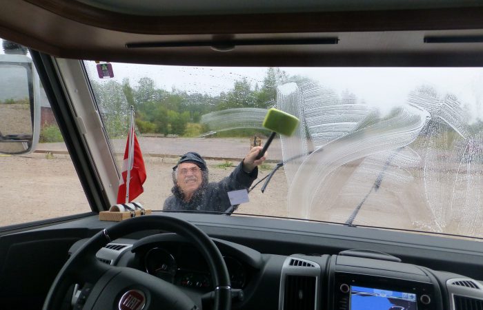 mit Stromanschluss für ein Drittel des Preises. Die Aussicht wäre prächtig, wenn es nicht regnen würde. Michael nützt den Regen, um die Fenster zu reinigen.
