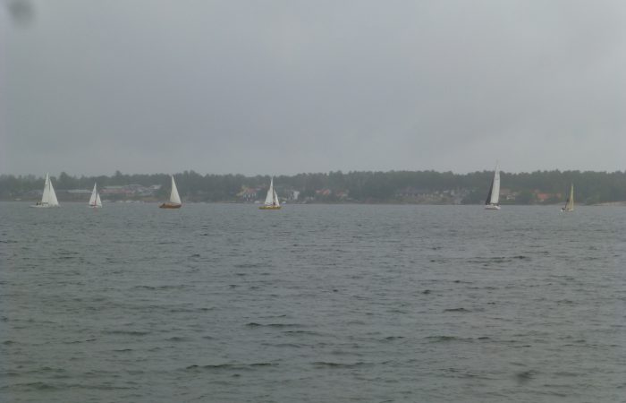 Der Regen wäscht dann das Spühli weg und es gibt keine Schmutzstreifen. Diese verrückten Schweden halten ihre Mittwochs-Regatta doch tatsächlich auch bei diesem Schietwetter ab. Wir aber sassen hoch und trocken und warm und genossen es zuschauen zu können.