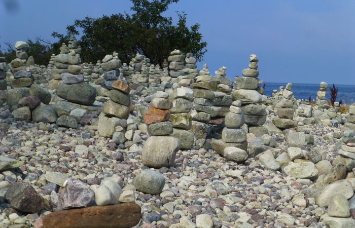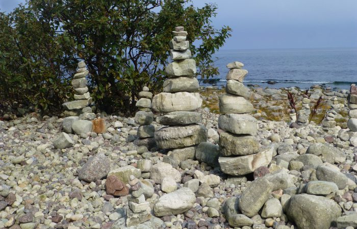 Fuss umrunden. Die Küstenlandschaft besteht aus viel Buschwerk und am Ufer aus vielen Steinen. Das animiert viele Leute daraus Steinmännchen zu bauen.