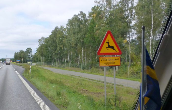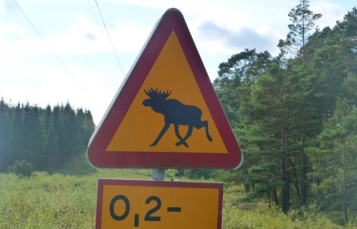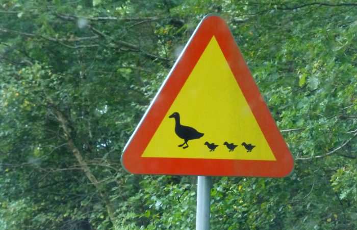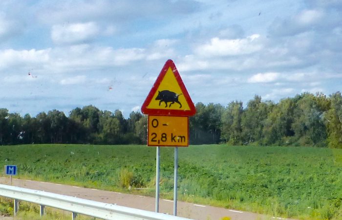 Es tauchten heute neue und für uns fremde Warnschilder auf. Nicht Hirsch- oder Elchschilder. Man warnte hier vor Wildschweinen und Enten.