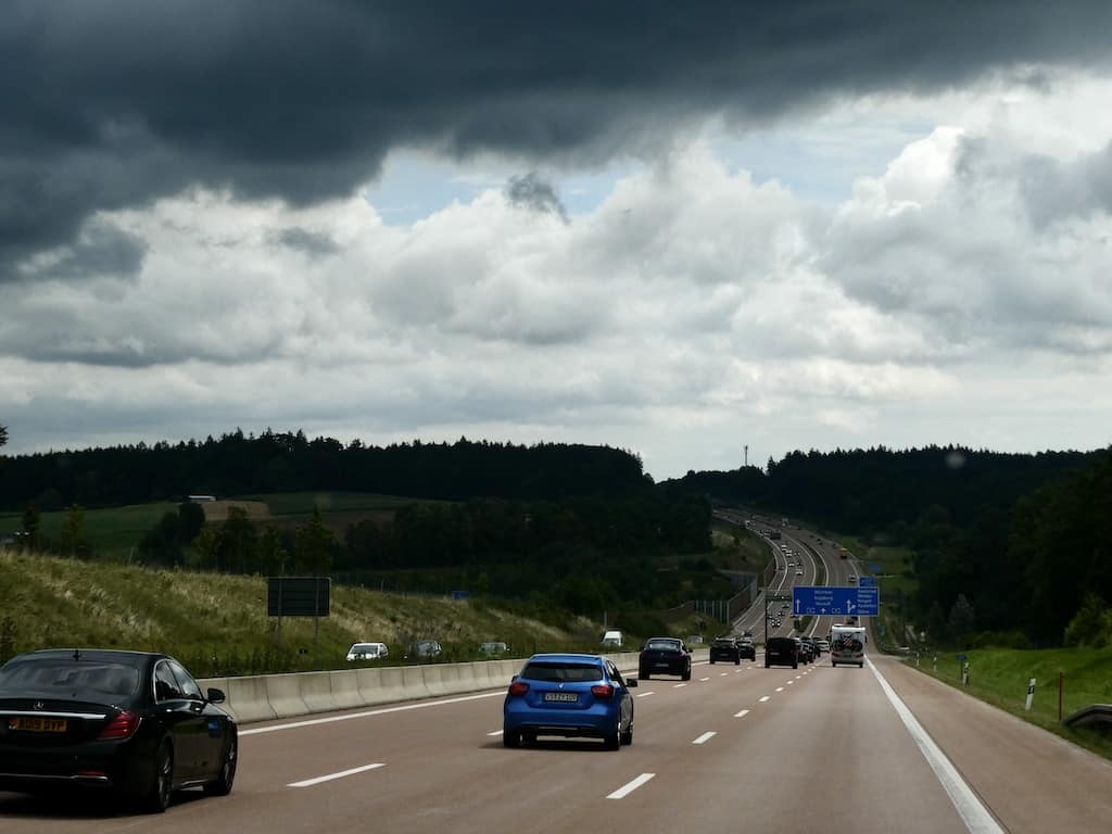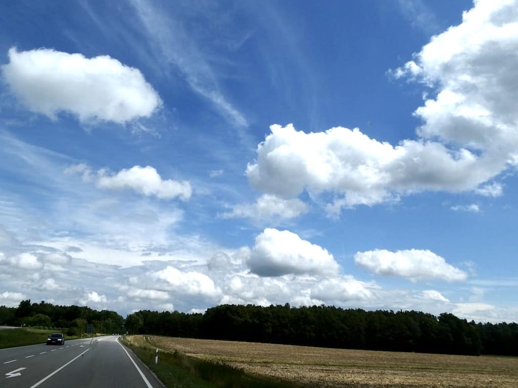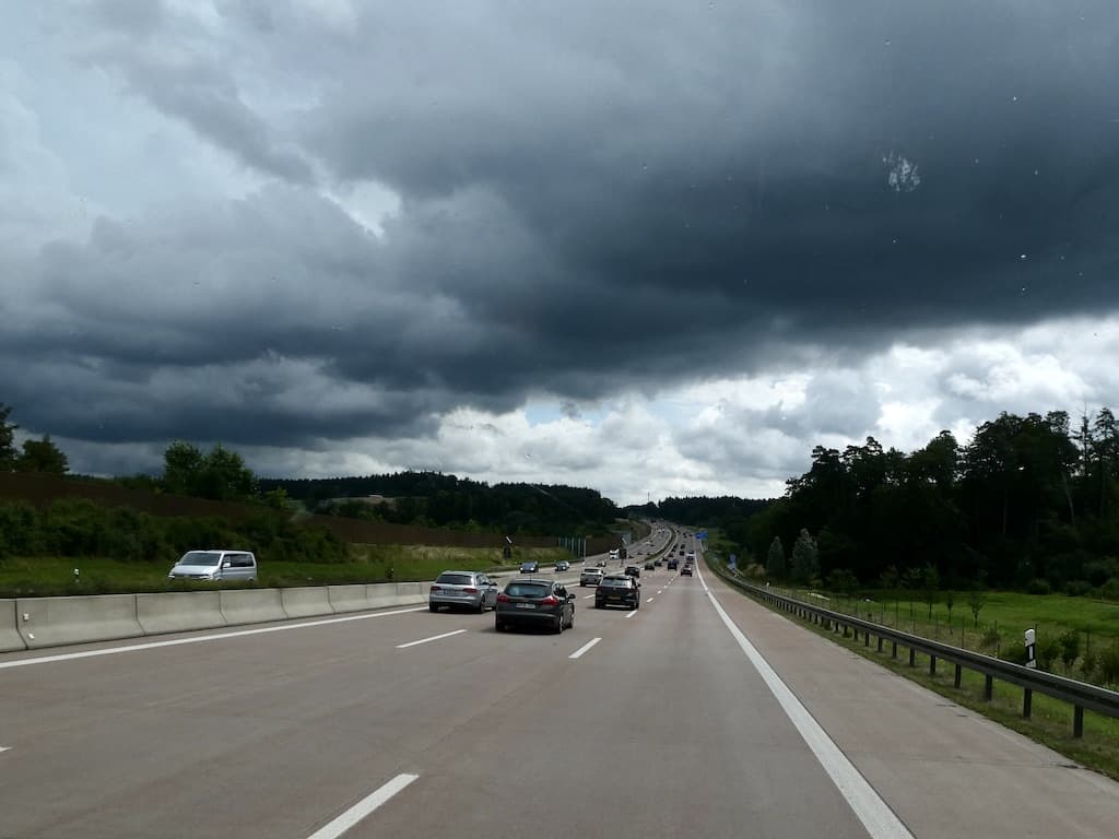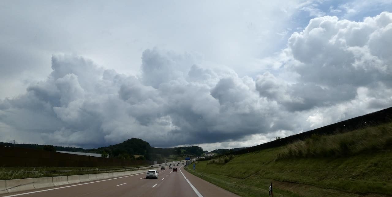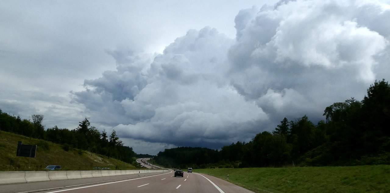 Nach dem Einkauf fahren wir ein Stück östlich auf der Autobahn A8/E52. Die Bilder der Wolken sind gewaltig und faszinieren uns.