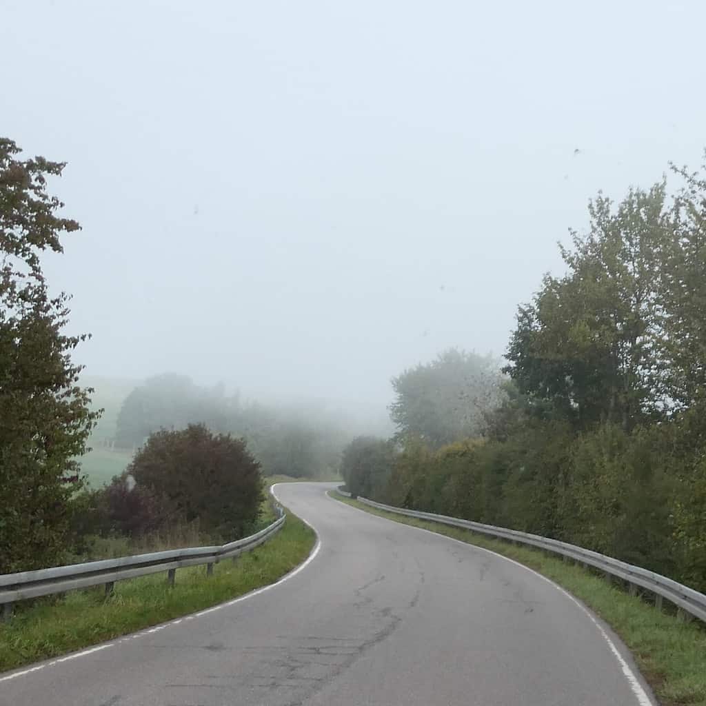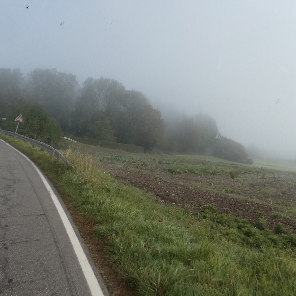Heute wollen wir die Saarschleife von oben betrachten. Dazu fahren wir hinauf nach Orscholz auf den Reisemobilparkplatz beim Gesundheitszentrum. 200 Meter höher gelegen kommen wir aus dem Nebel.