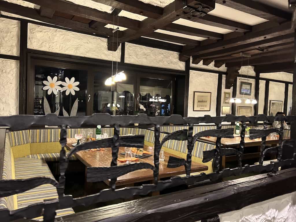 Auf dieses ungewohnte Theater mit unserem Fahrzeug gönnen wir uns die Einkehr im Restaurant unseres Gastgebers. Wir sitzen mit unseren Camper-Nachbarn Andrea und Eckard zusammen, die uns bei der holprigen Ankunft so behilflich waren. Wir haben uns auch sehr gut unterhalten. Das Essen war gut und der Wein, – naja, der Weisse war besser als der Rote, aber man konnte ihn trinken. Das Lokal ist gemütlich.