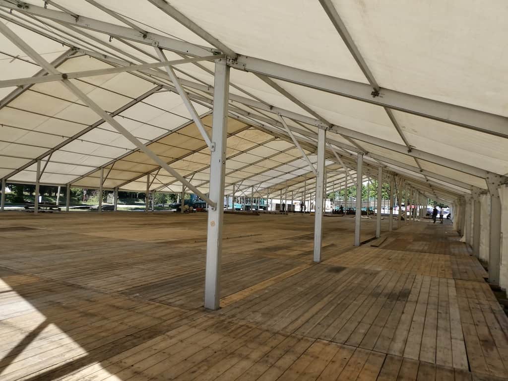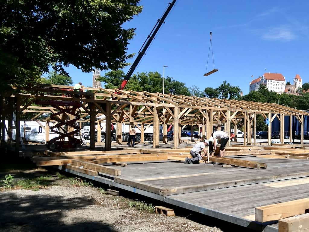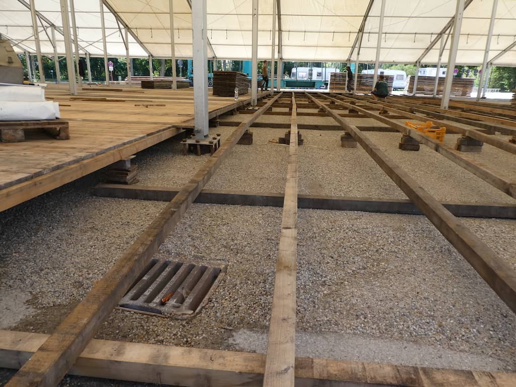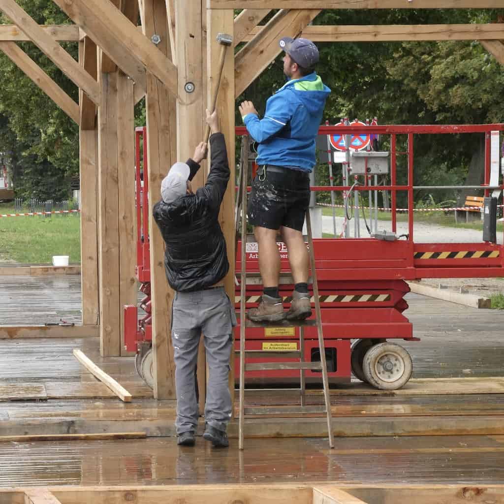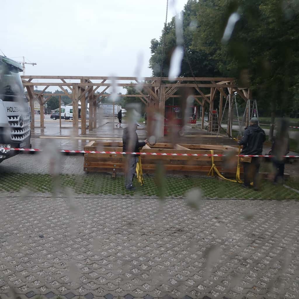 Da der Camper auf unserer Steuerbordseite wegfuhr, haben wir nun freie Sicht auf den Festplatz. So können wir im Trocknen schön dem Aufbau einer Holzkonstruktion für den nächsten Anlass zuschauen. Die armen Handwerker müssen im Regen arbeiten.