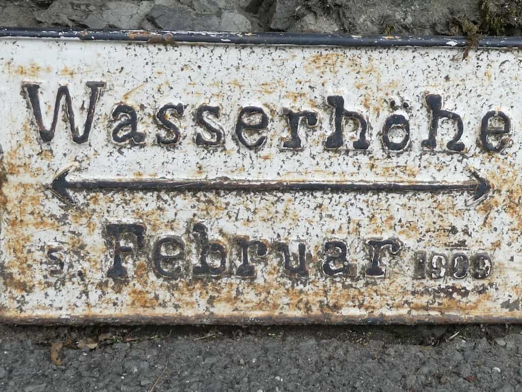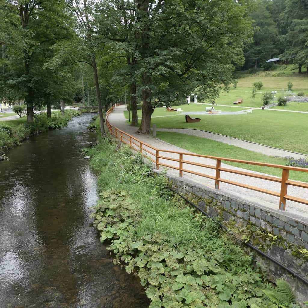 Es geht auch lange bis wir endlich den Kurpark finden. Er liegt Flussaufwärts fast am Ende des Ortes. Eine Hochwassermarke am Weg zeigt, dass das Wasser des Weißen Mains am 5. Februar 1999 geschätzte 3 Meter höher stand.