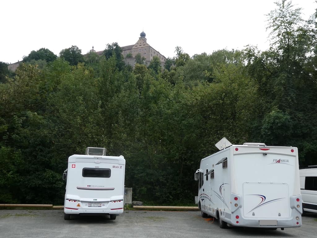 Auch dieser Stellplatz ist hoffnungslos überlaufen. Aber nach kurzer Zeit in Warteposition wird ein idealer Platz für uns frei. Glück muss man haben. 100 Höhenmeter über uns thront die Plassenburg.