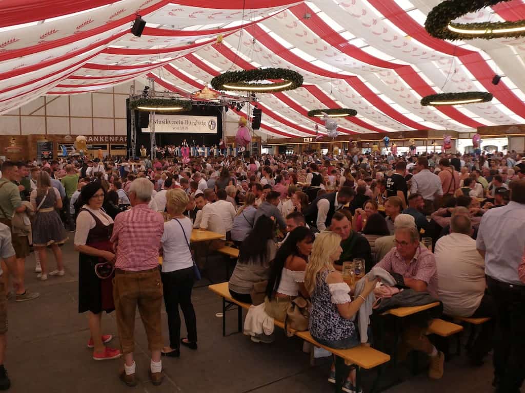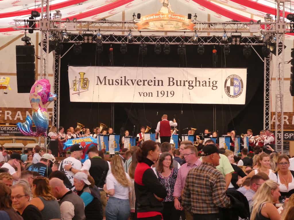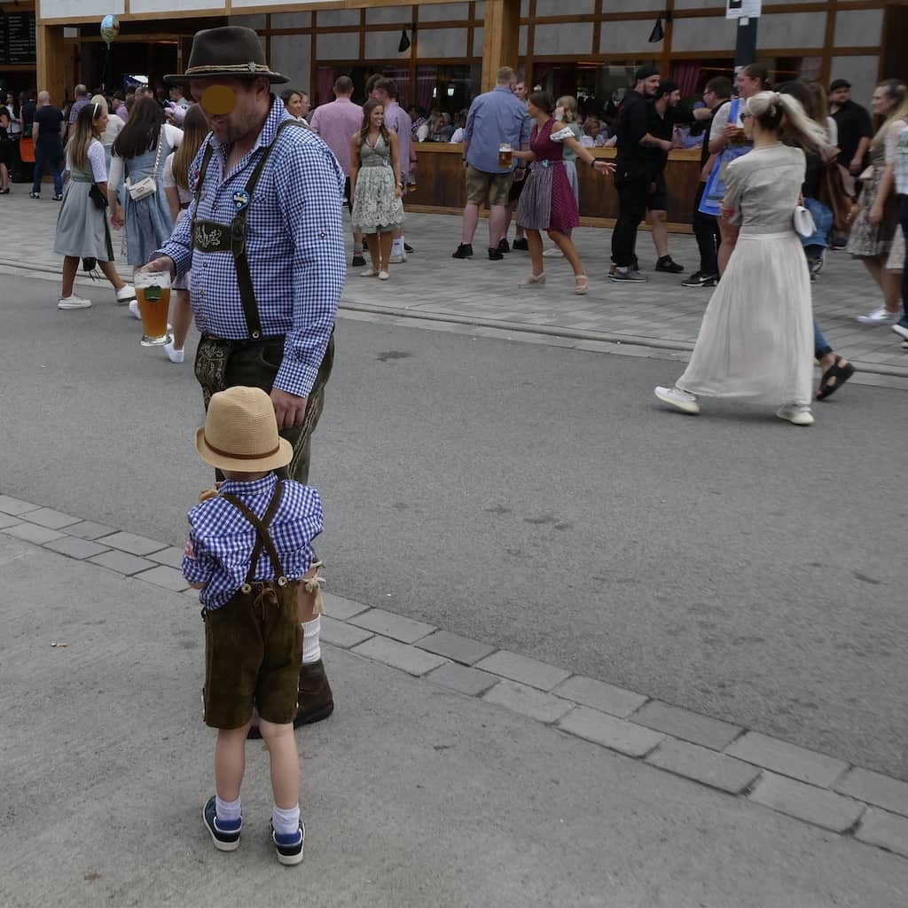 Der Stellplatz liegt nur etwa 500 Meter vom Ortskern entfernt. Uns interessiert in erster Linie die historische Altstadt, aber wir kommen unweigerlich in den Festtrubel hinein. Die meisten sind in der hübschen bayerischen Tracht mit der Krachledernen und dem Dirndl gekleidet. Fesch schaun’s aus! Als Stilbruch erachten wir jedoch, wenn dazu Turnschuhe getragen werden.