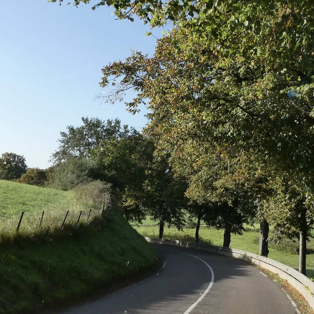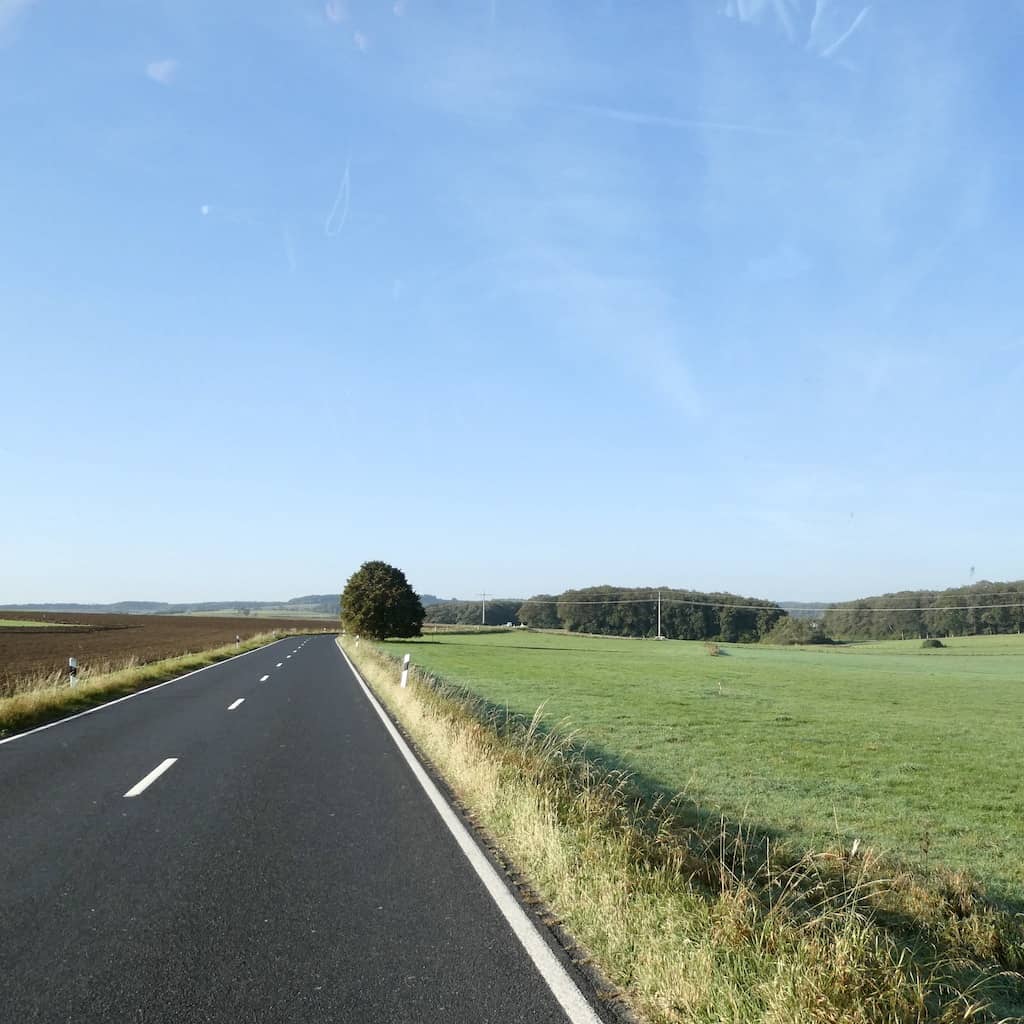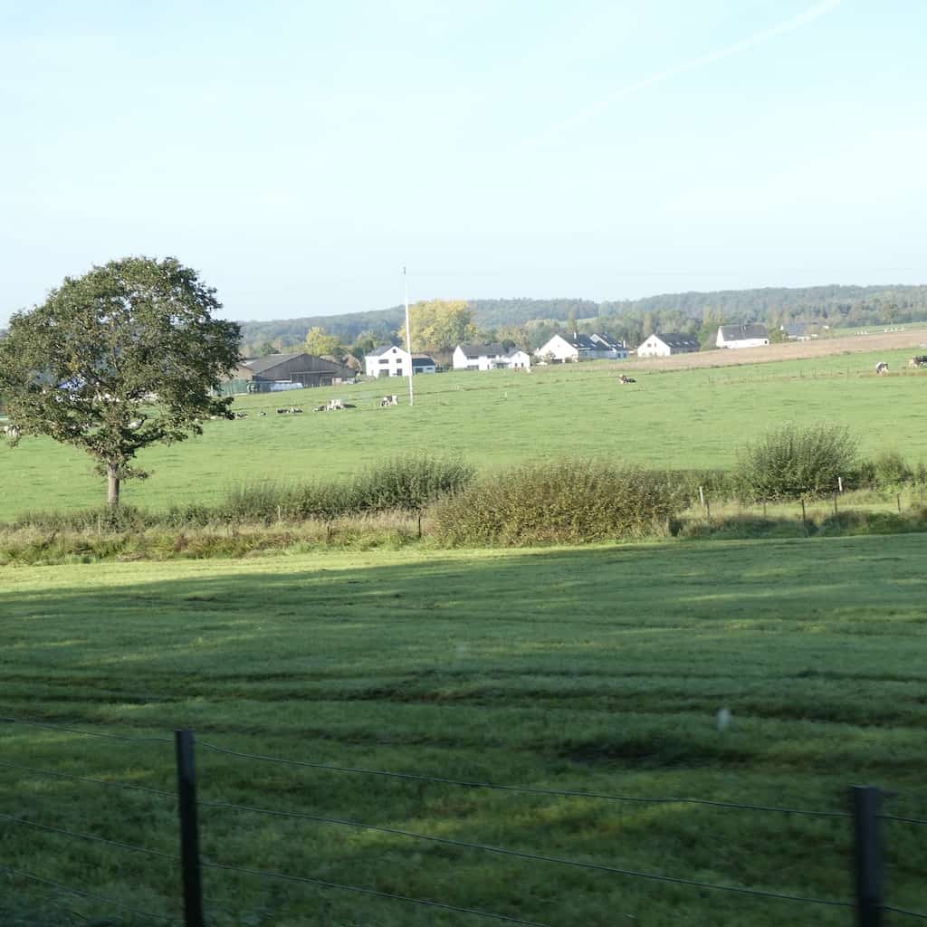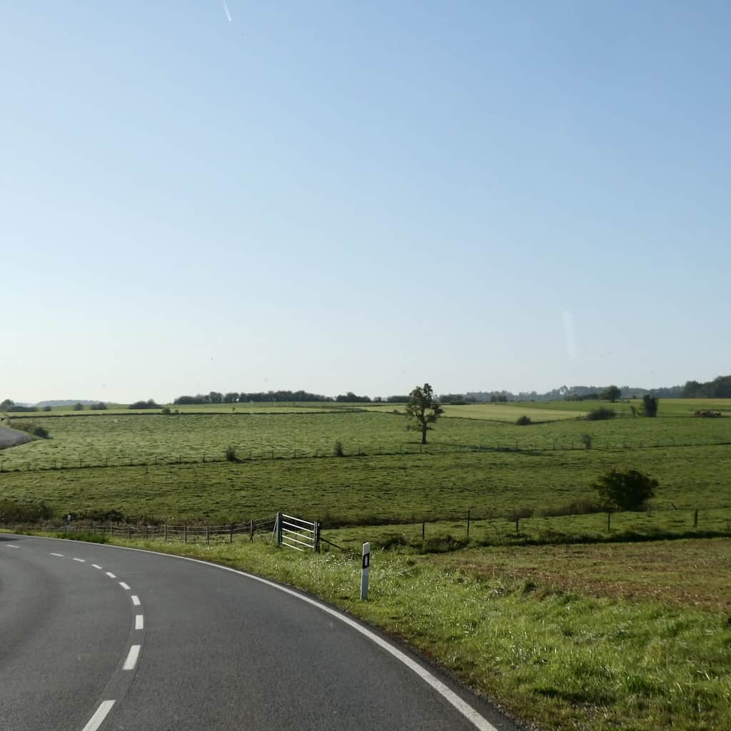 Vom Stellplatz Waldbillig im Mullerthal fahren wir auf einer Hochebene durch eine grüne Landschaft mit viel Landwirtschaft.