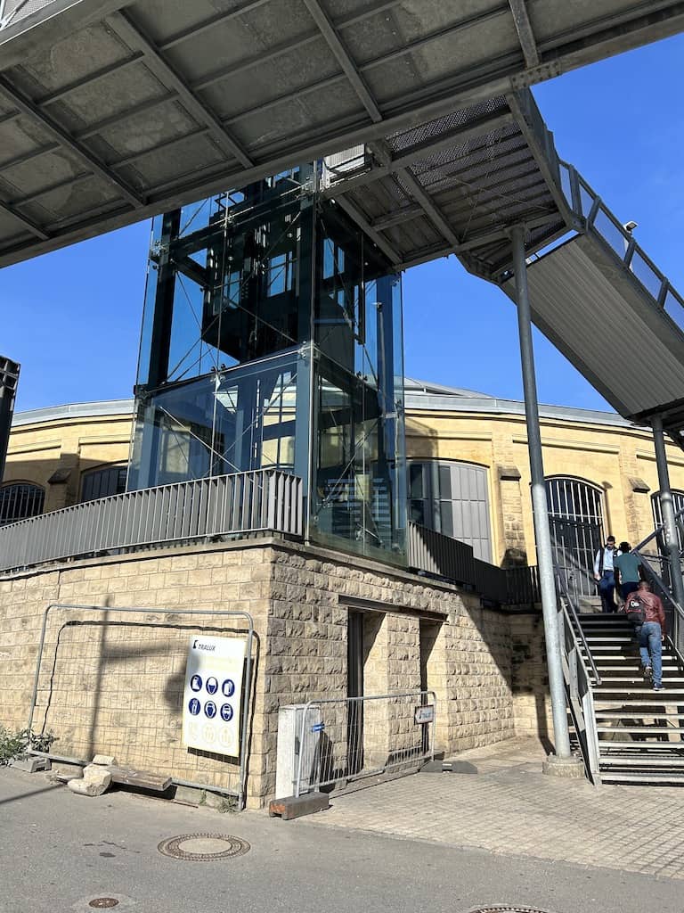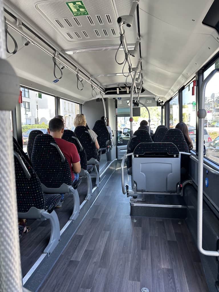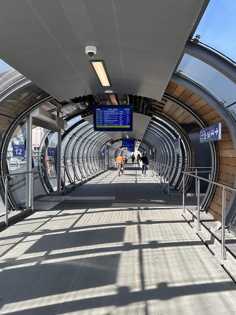 Nach einer Busfahrt von etwa 15 Minuten ist man am Hauptbahnhof. Dann muss man auf einer langen Passerelle die Geleise überqueren, um zur Strassenbahn zu kommen. Die bringt einen in 10 Minuten ins Zentrum. Das ist schon toll mit den kostenlosen öffentlichen Verkehrsmitteln.