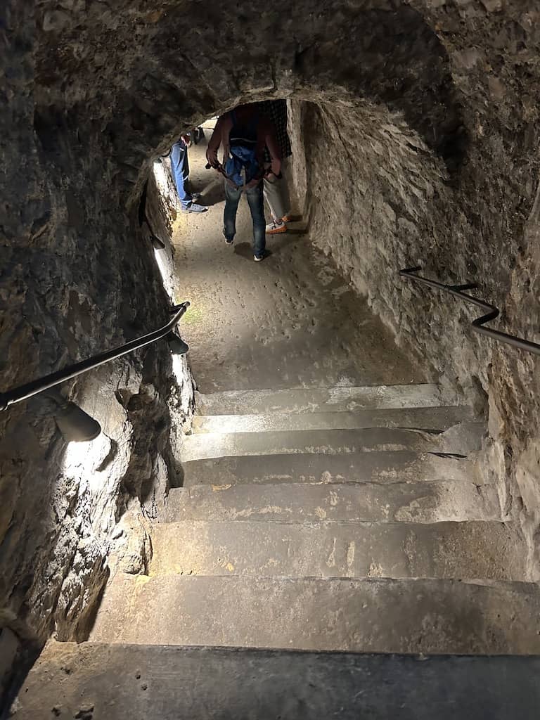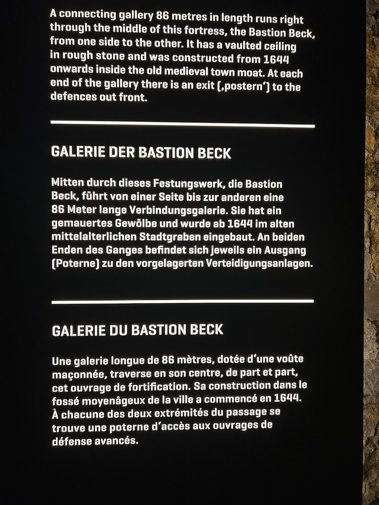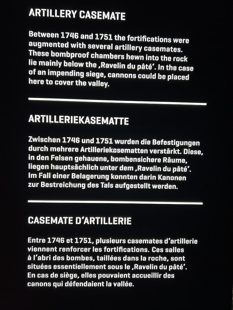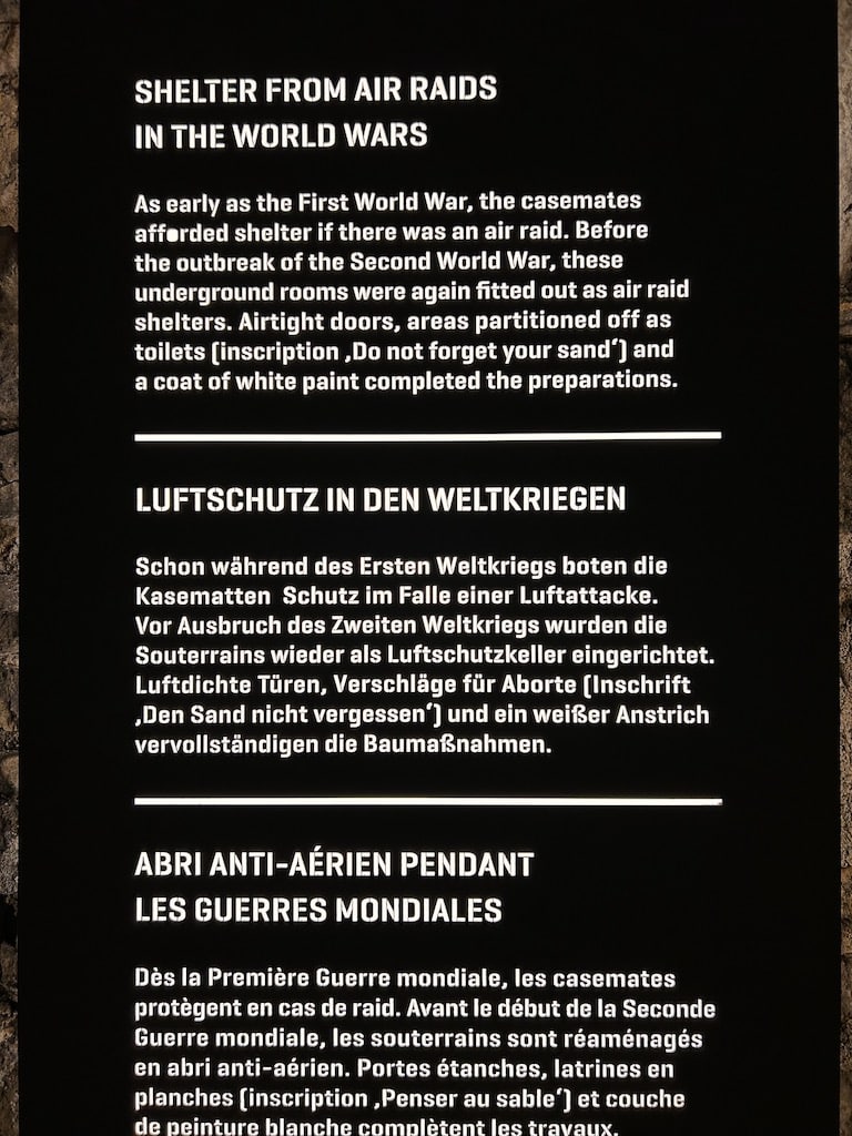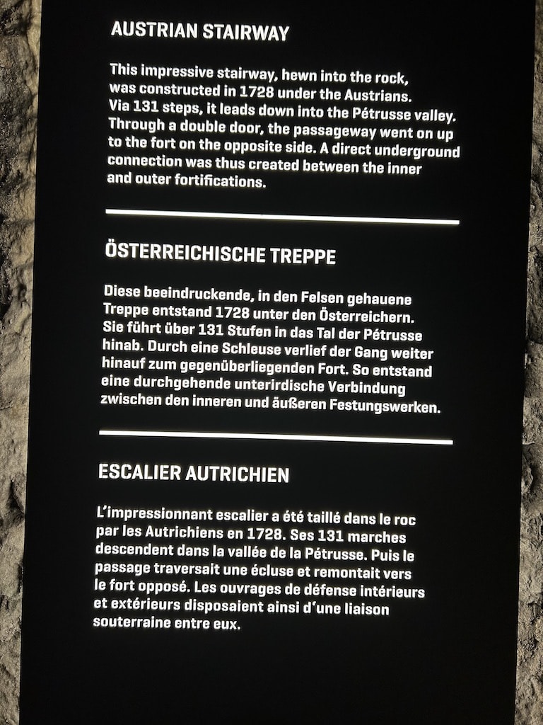 Im Untergrund der Stadt gibt es ein grosses Höhlensystem von ehemals 23 Kilometern Länge. Dieses Festungswerk wurde während der spanischen, französischen und österreichischen Herrschaft gegraben oder aus dem Fels gesprengt. Teile davon sind heute wieder zugänglich. Michael macht eine geführte Tour durch die Pétrusse-Kasematten mit. Im Untergrund führen lange Gänge und 242 Stufen zu einem Ausgang unten beim Flüsschen Pétrusse. Hier eine Bildfolge aus dem Untergrund: