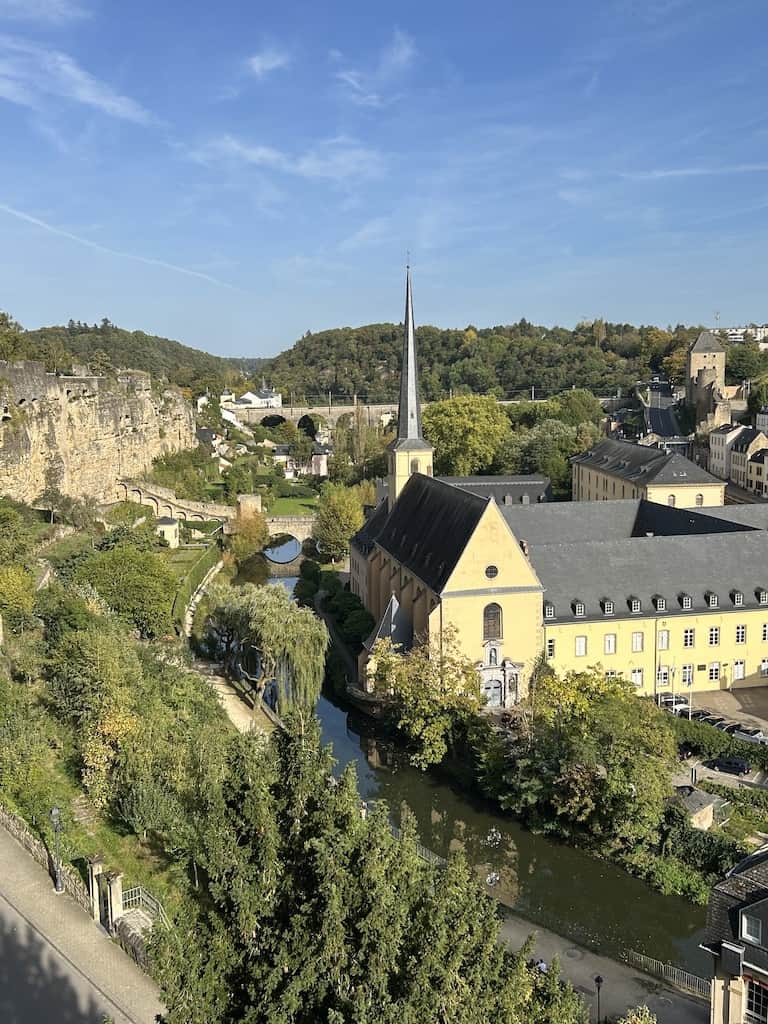 Von der Festungsmauer, der «Corniche» hat man einen schönen Blick auf die Benediktiner-Abtei «Neimënster» aus dem Jahre 1606 und die Bockfelsen, hinter der sich die Bock-Kasematten verbergen.