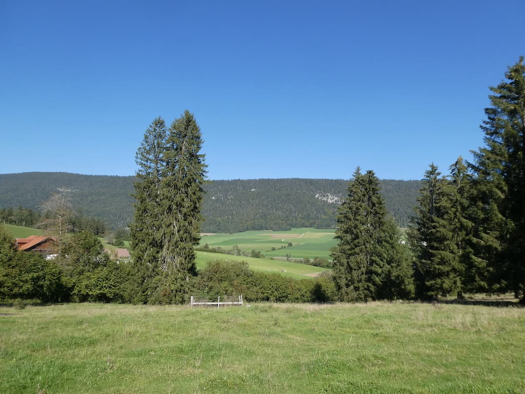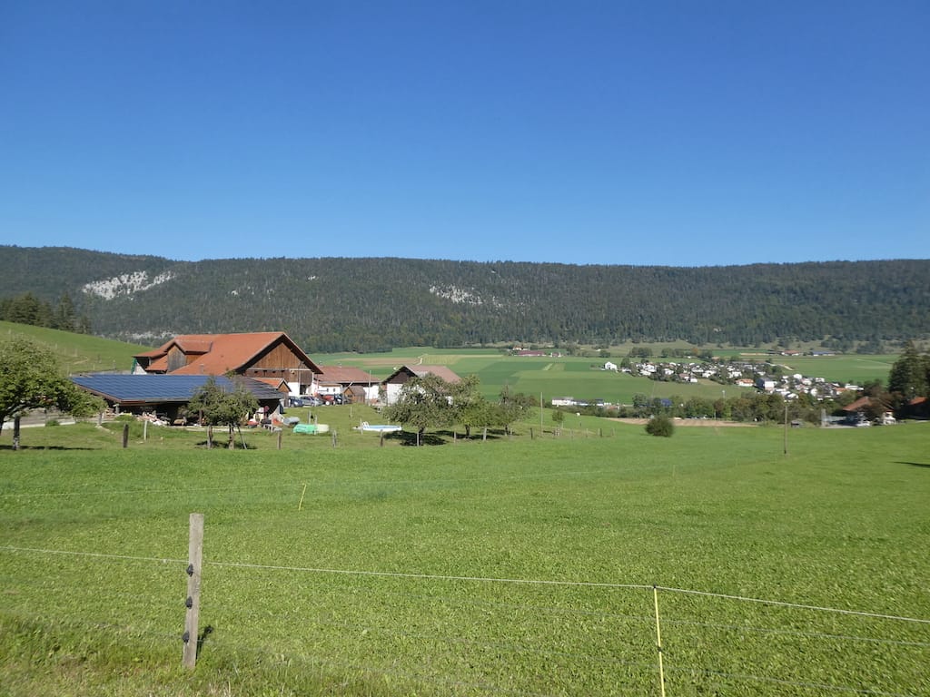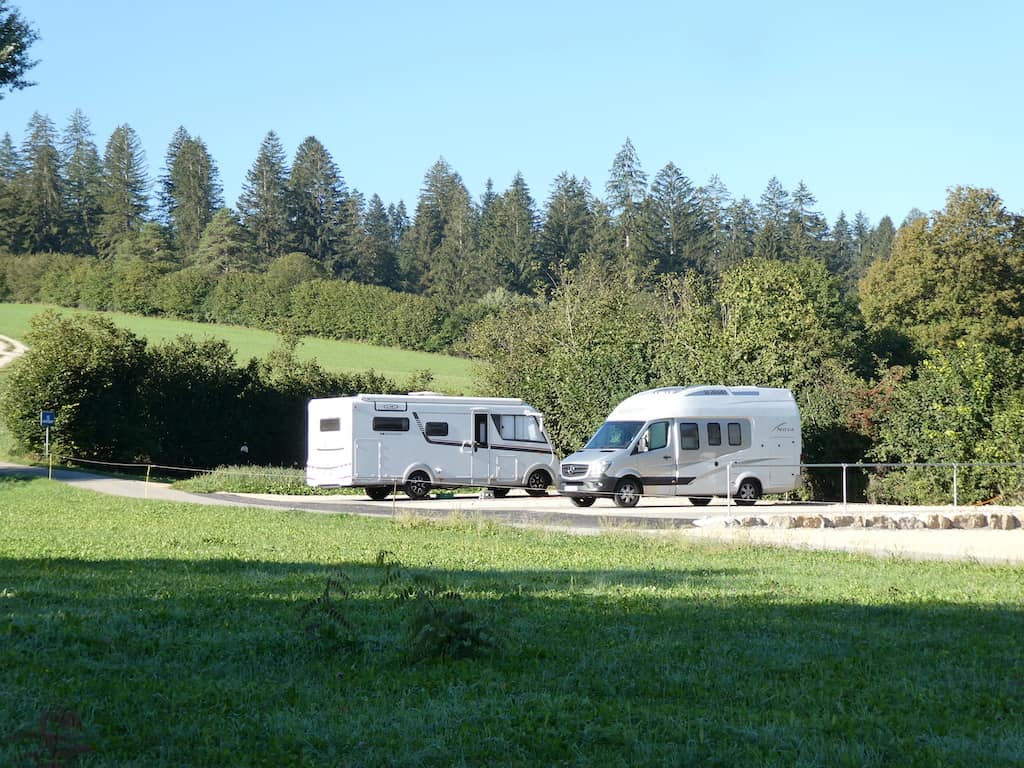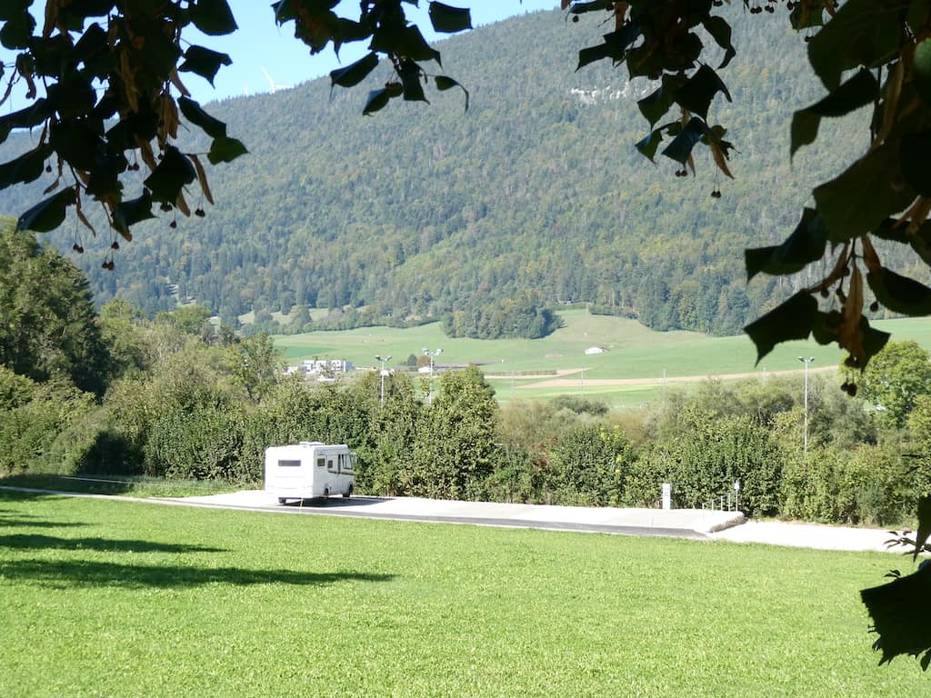 Auf unserem Morgenspaziergang, teilweise durch die noch feuchten Wiesen, wären wir mit unseren Wanderschuhen sicher besser bedient gewesen. Von der Höhe aus geniessen wir die Schönheit dieser Juralandschaft. Als wir zurückkommen, steht unser Mobi ganz alleine auf dem Stellplatz.