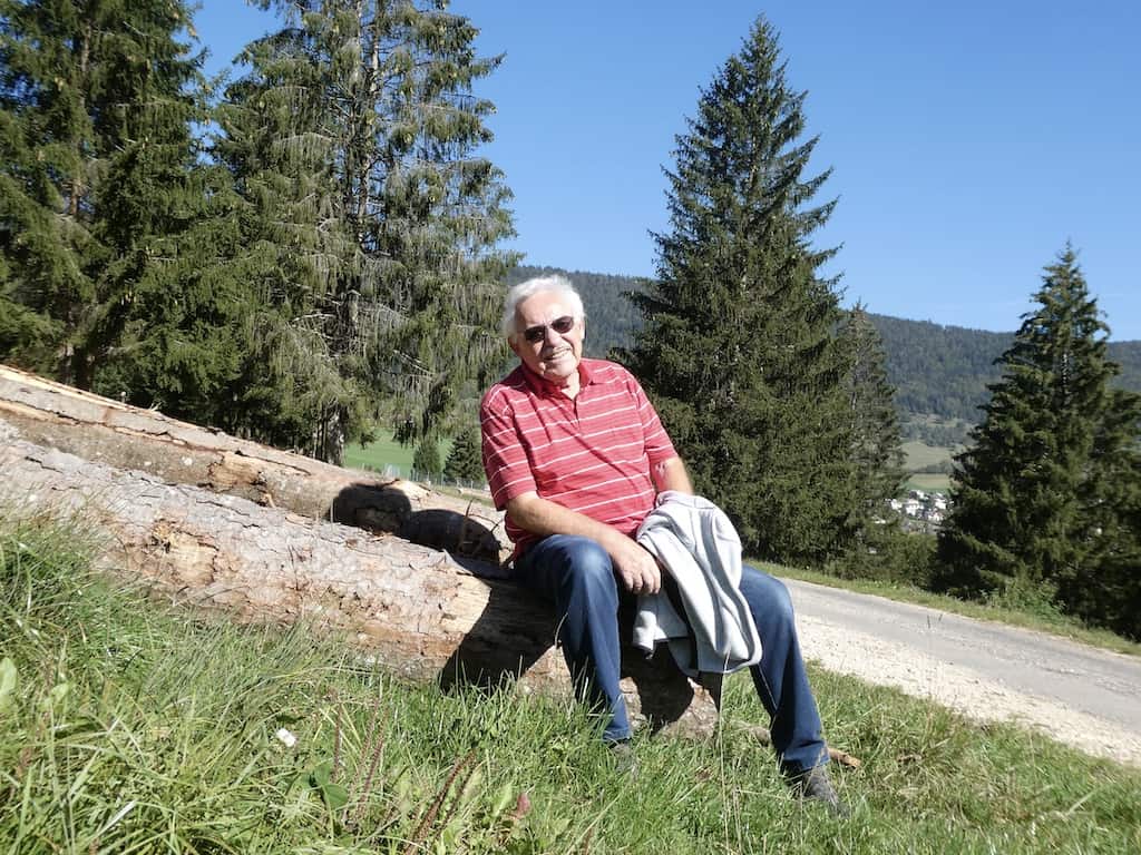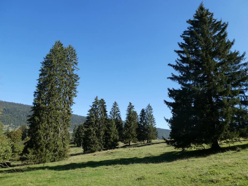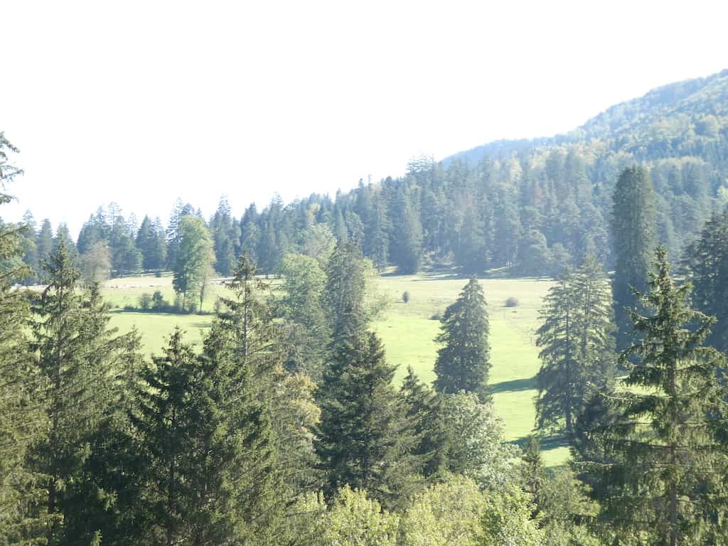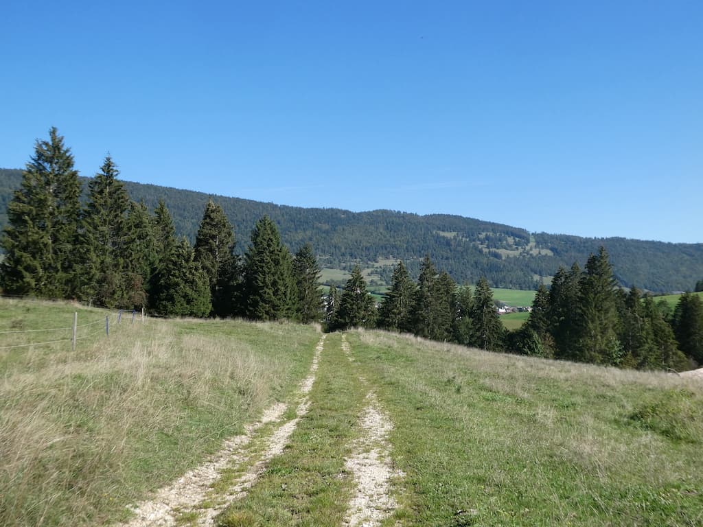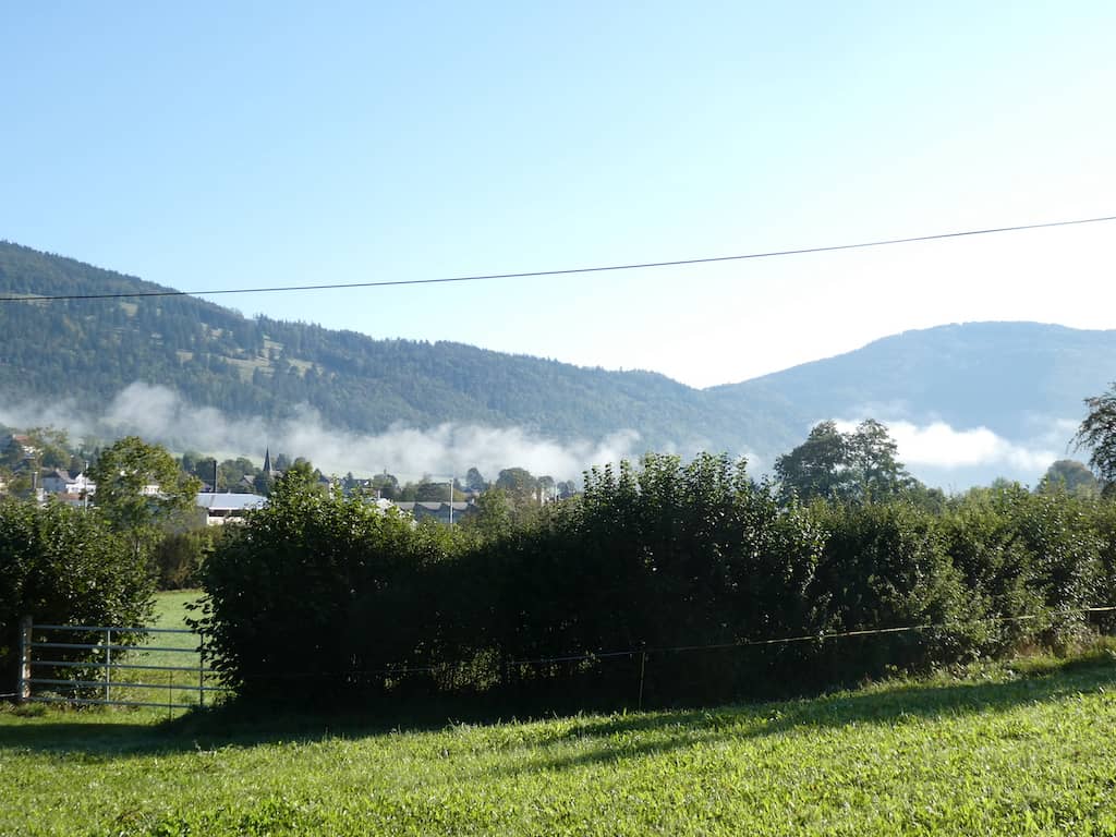 Auf unserem Morgenspaziergang, teilweise durch die noch feuchten Wiesen, wären wir mit unseren Wanderschuhen sicher besser bedient gewesen. Von der Höhe aus geniessen wir die Schönheit dieser Juralandschaft. Als wir zurückkommen, steht unser Mobi ganz alleine auf dem Stellplatz.
