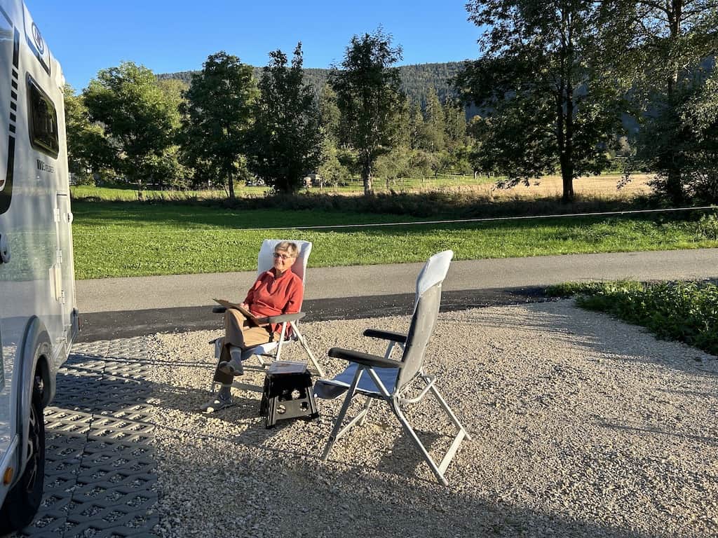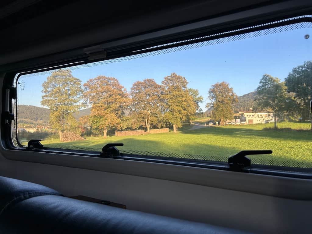 Den Rest des Tages verbringen wir in Ruhe auf dem Stellplatz. Als es im Freien zu kühl wird, verziehen wir uns in den Mobi und geniessen von da die traumhafte herbstliche Landschaft in der Abendsonne.