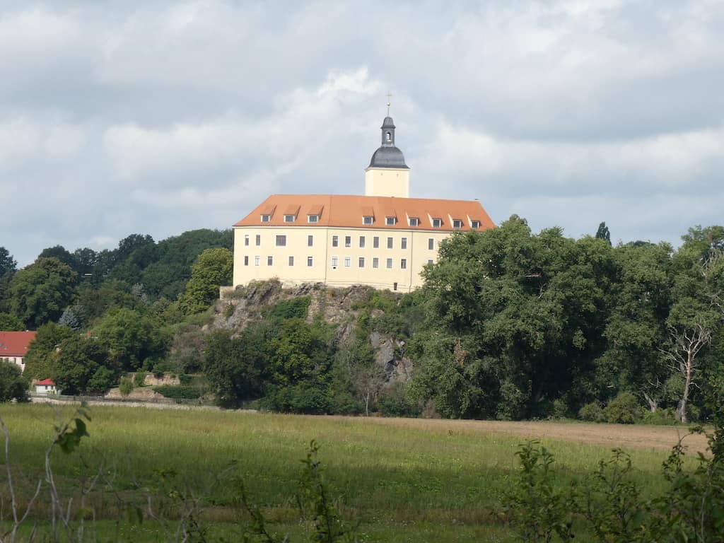 Bei Neuseußlitz sehen wir Weinberge und am anderen Elbufer das Schloss Neuhirschstein.