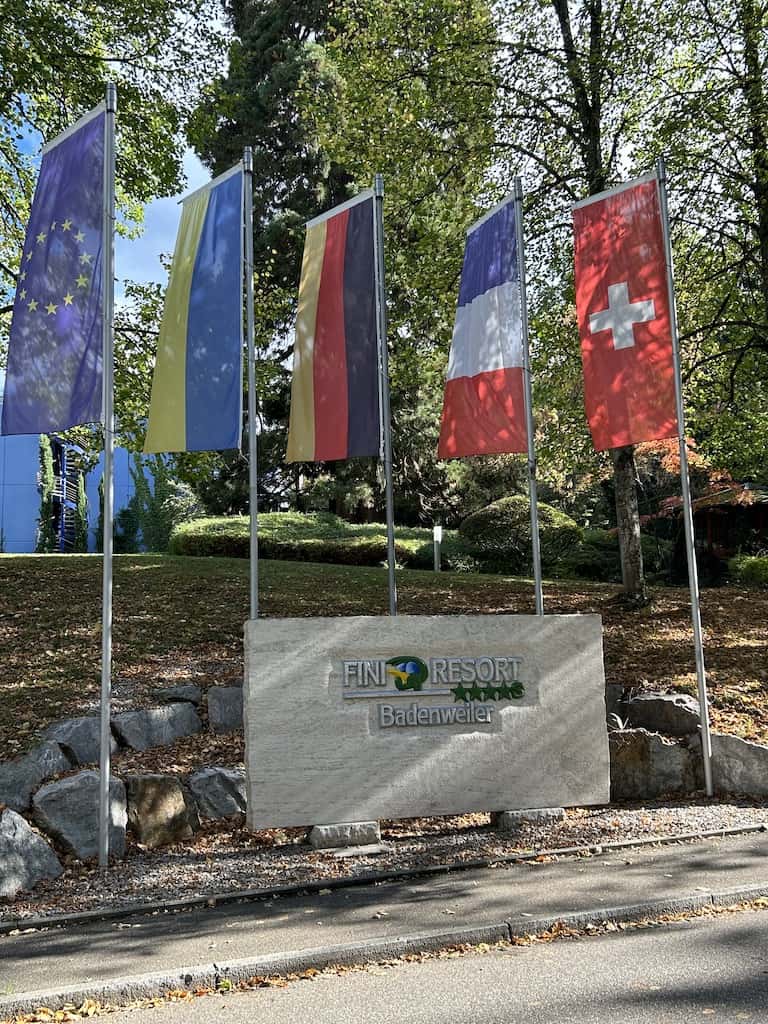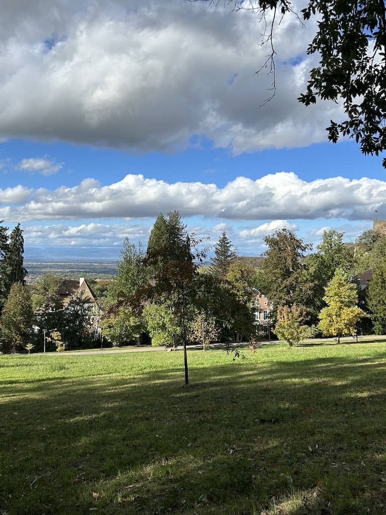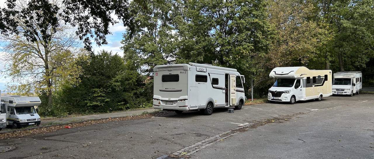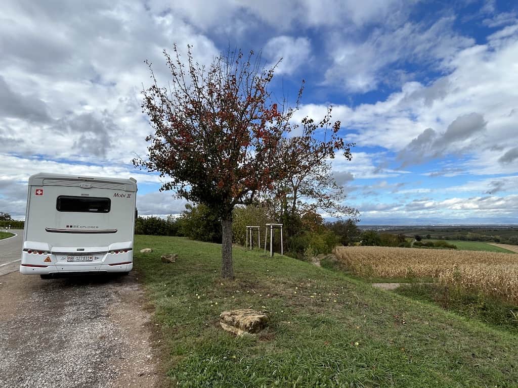 Unser Endziel für heute ist ein Parkplatz ohne jegliche Infrastruktur oberhalb von Badenweiler. Hier dürfen Camper kostenlos übernachten, allerdings muss man € 3.20 pro Person und Nacht Kurtaxe abliefern. Der Weg hinunter zum Touristenbüro hat es in sich. Es sind zwar nur 800 Meter, aber gefühlt ebenso viele Höhenmeter.