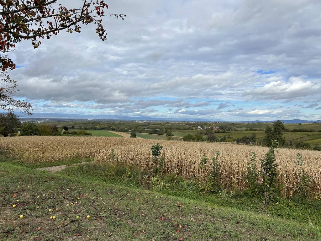 Wir fahren weiter durch die Ortenau, ein Gebiet, in dem Obst, Spargel, Maronen und Wein wegen des milden Klimas besonders gut gedeihen. Unterwegs bei einem Obststand kaufen wir eine ganze Kiste Äpfel direkt vom Produzenten.
