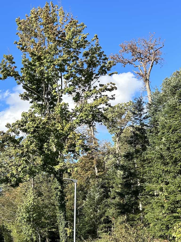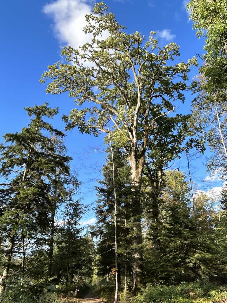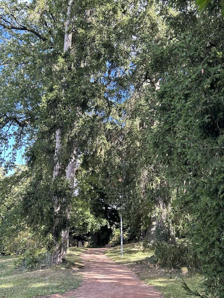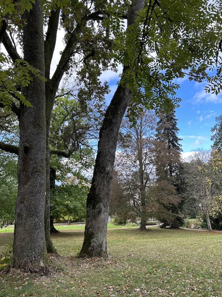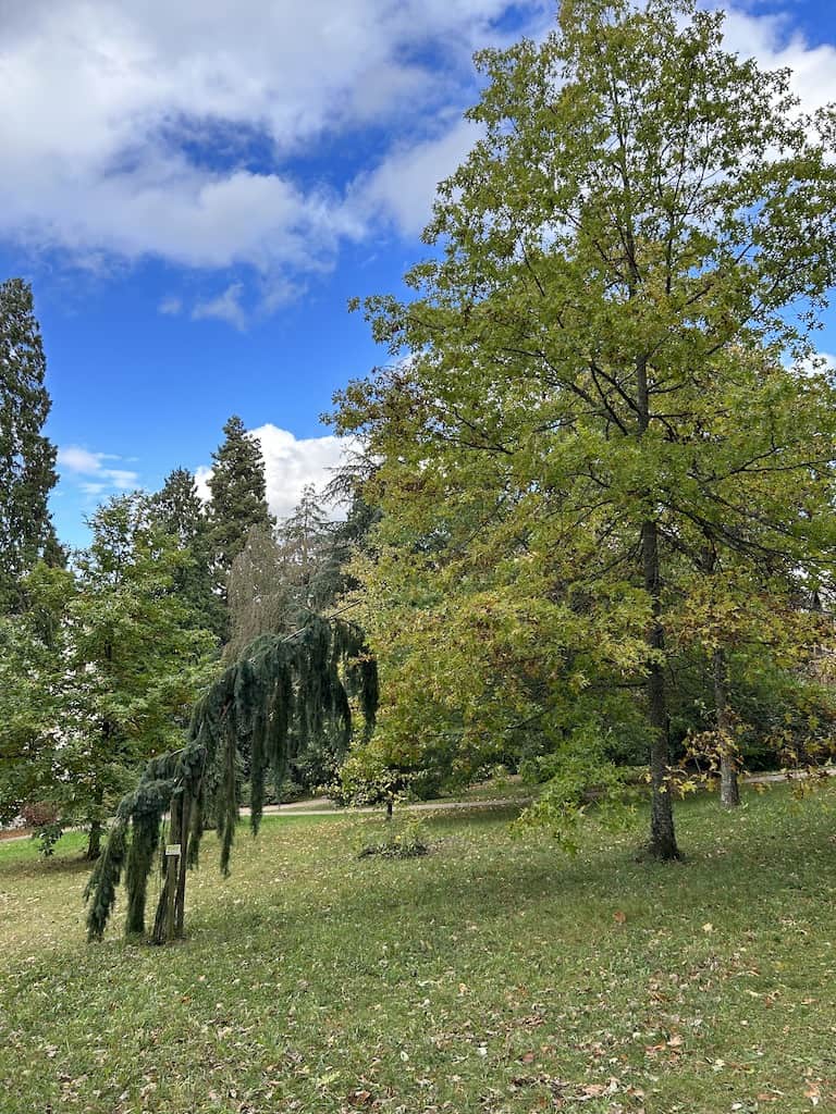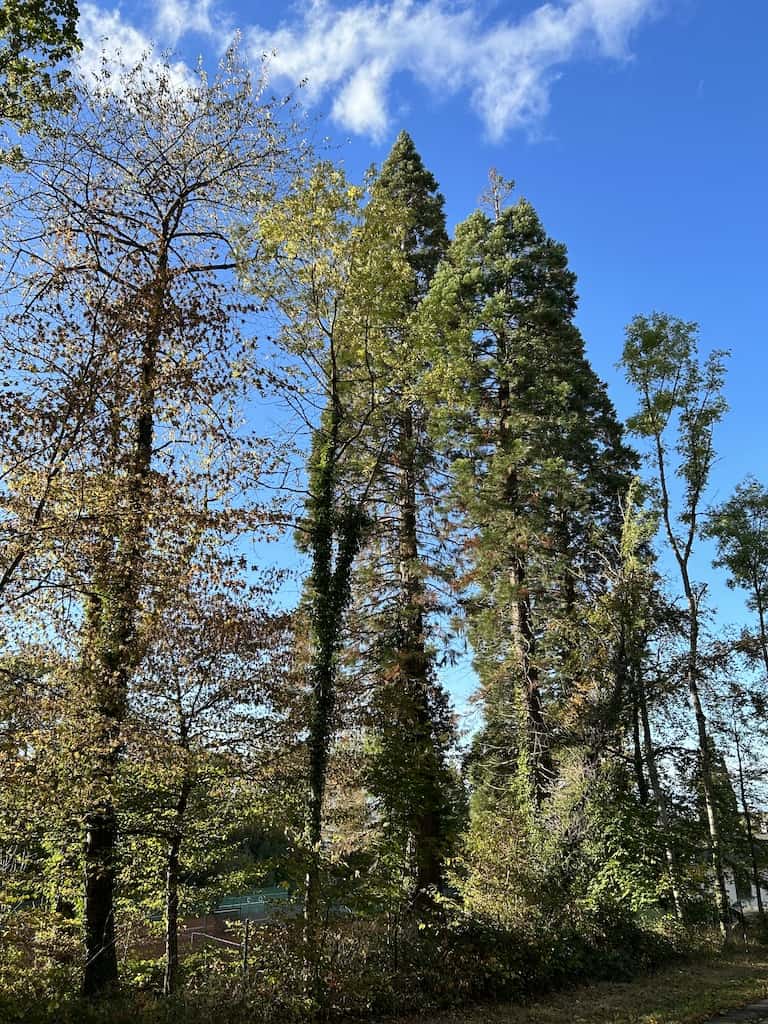 Nachdem wir uns wieder erholt haben, machen wir noch einen Waldspaziergang. Es gibt hier mächtige alte Bäume, nicht nur einheimische. Wir sehen Eichen aller Art, Bergahorn und Spitzahorn. Riesenmammutbaum, Blauglockenbaum, amerikanischen Amberbaum und Kampferbaum. Adlerfarn, Tannen und einen Urweltmammutbaum und vieles mehr.