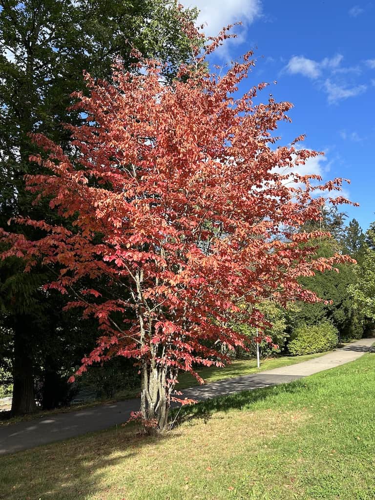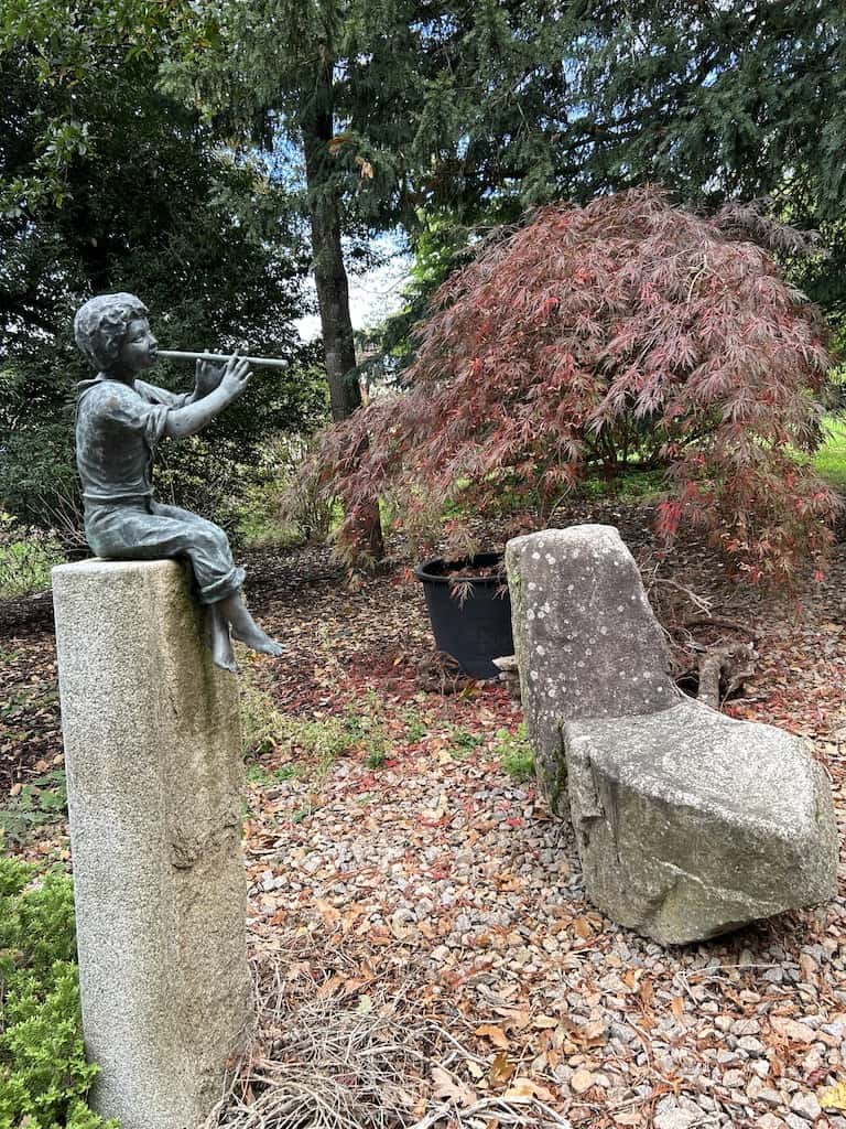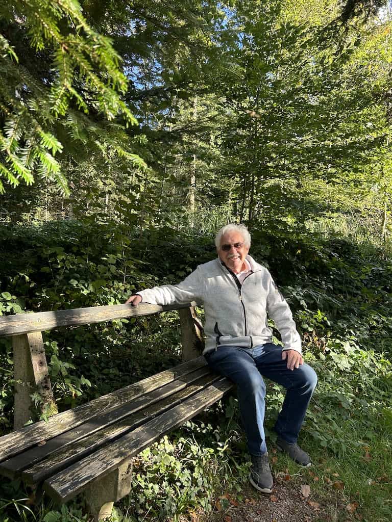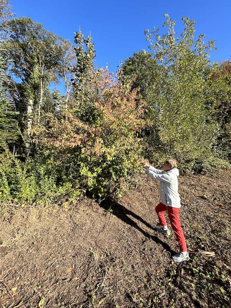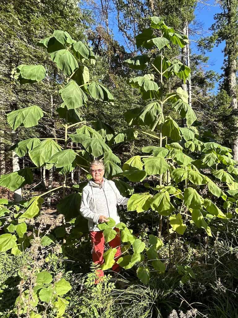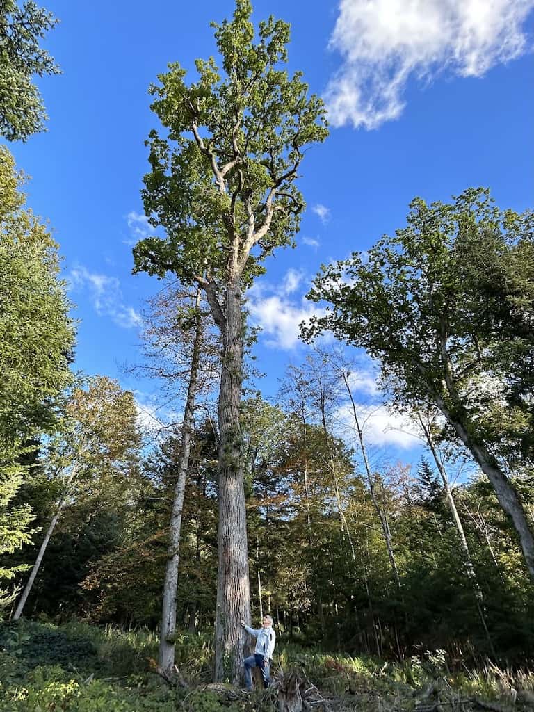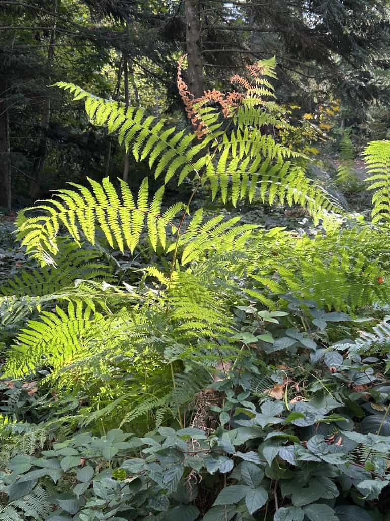 Nachdem wir uns wieder erholt haben, machen wir noch einen Waldspaziergang. Es gibt hier mächtige alte Bäume, nicht nur einheimische. Wir sehen Eichen aller Art, Bergahorn und Spitzahorn. Riesenmammutbaum, Blauglockenbaum, amerikanischen Amberbaum und Kampferbaum. Adlerfarn, Tannen und einen Urweltmammutbaum und vieles mehr.