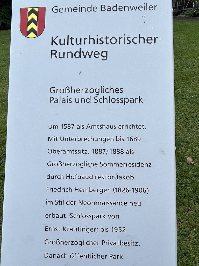Immerhin kann man dies mit einem Spaziergang durch den schönen Schlosspark verbinden und sich Badenweiler ansehen. Der Ort ist durch seine Thermalquellen beliebt. Vom Schlossplatz ist die Ruine Burg Baden zu sehen.