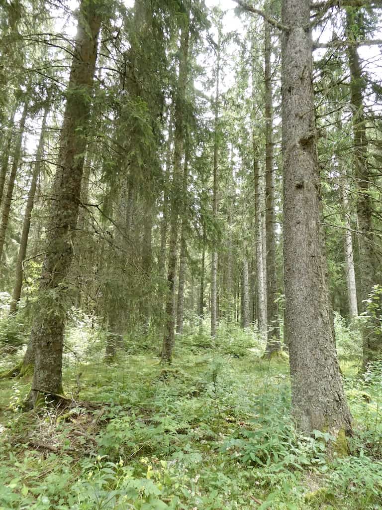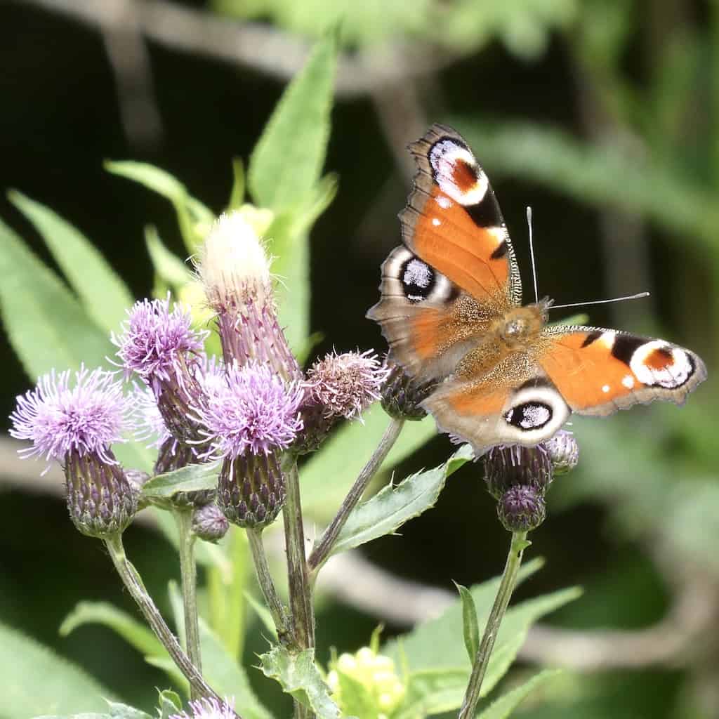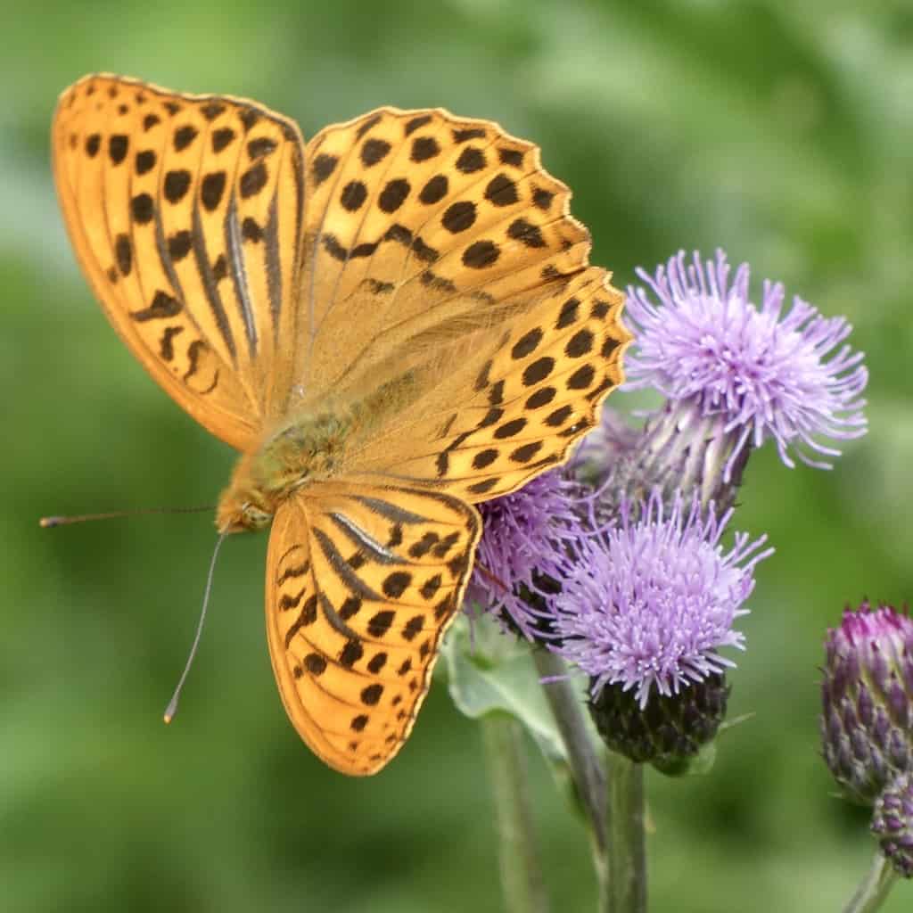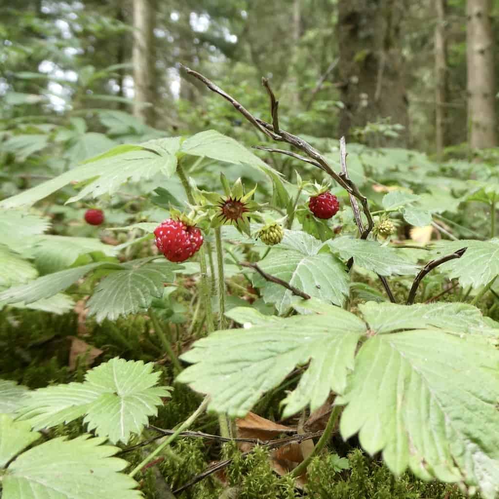 Am Wegesrand gedeihen Walderdbeeren und Schmetterlinge fliegen die Blüten auf der Suche nach Nektar an.