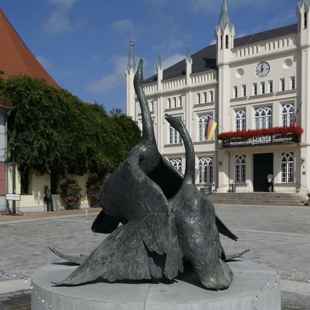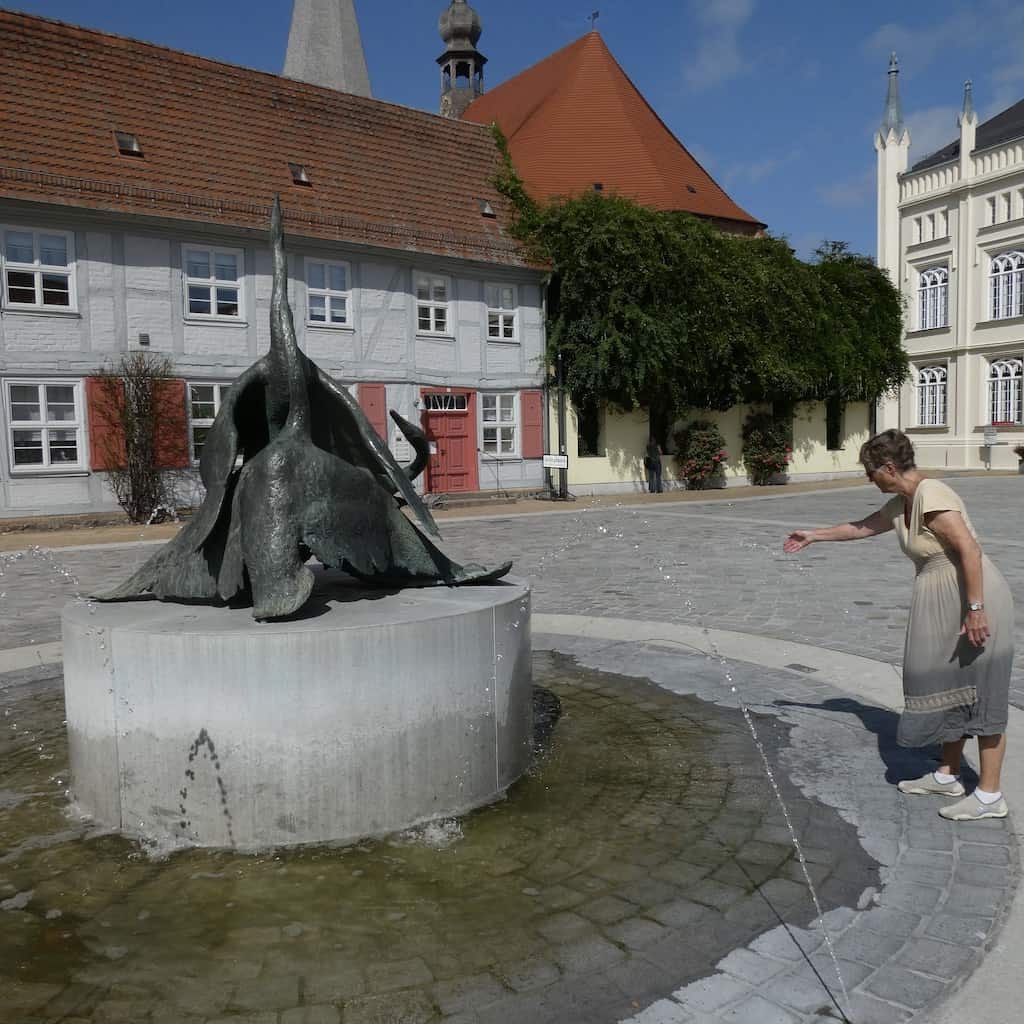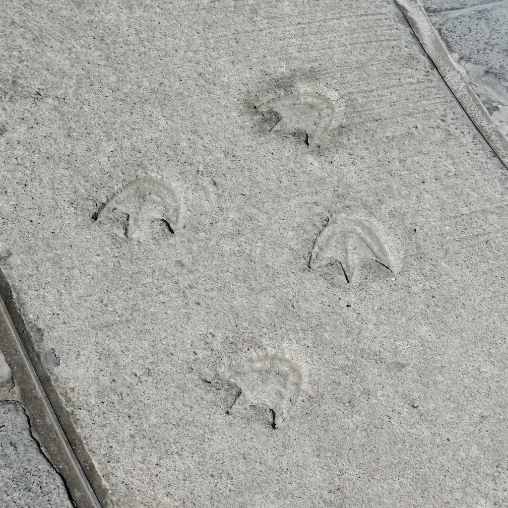 Beim Brunnen mit dem Schwanenpaar gibt es ein nettes Detail: die Fussabdrücke im Beton davor.