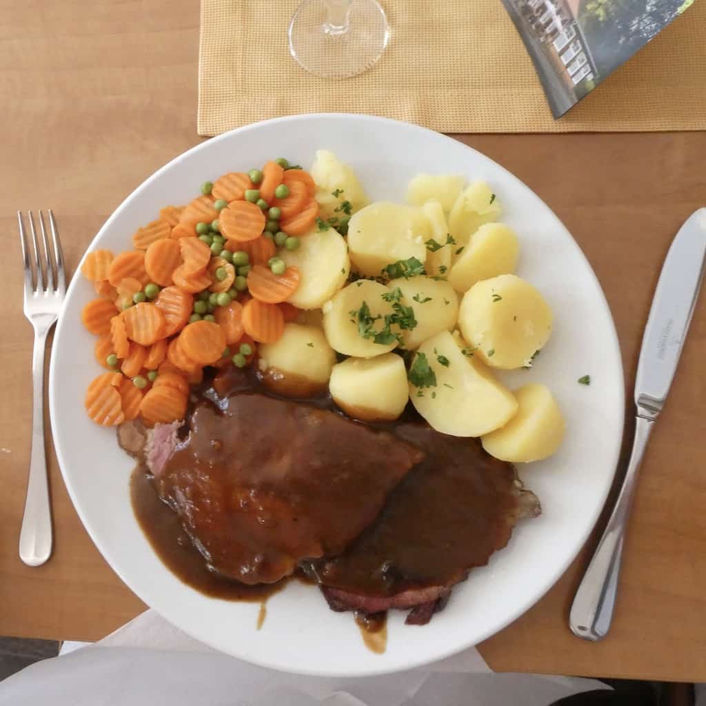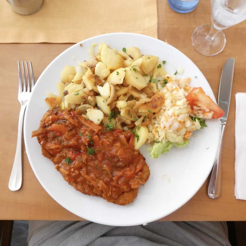 Das Essen ist sehr gut, aber auch sehr reichlich. Die Hälfte lassen wir uns einpacken zum Mitnehmen.