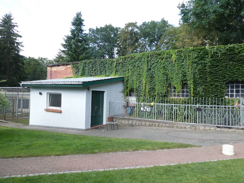 Beim Nebengebäude kann man hinter dem Efeu noch das alte Gemäuer der Stallanlagen erkennen. Davor ist heute eine Vogel-Volière und daneben ein kleiner Weiher, in dem jede Menge Kois schwimmen. Alles ist liebevoll gepflegt und sehr sauber.