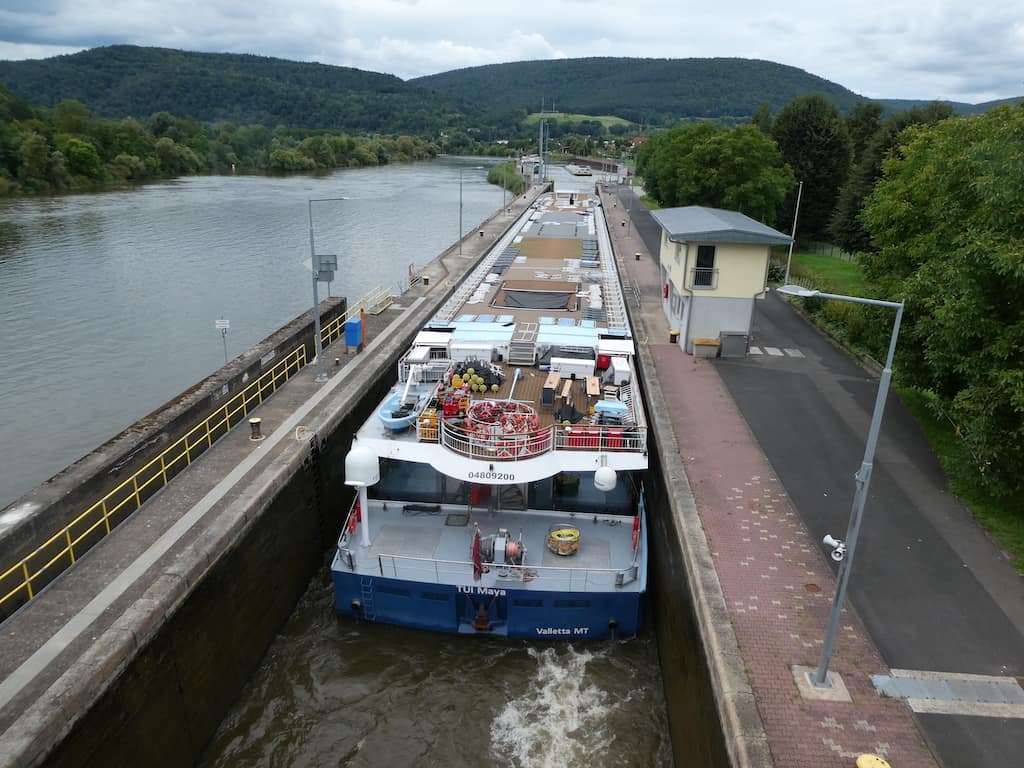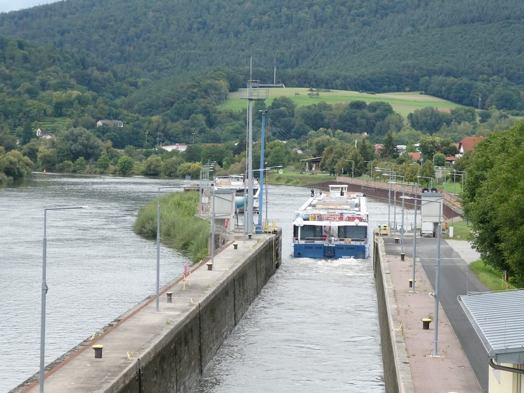 Von Wertheim (eine sehenswerte, uns jedoch bekannte Stadt) fahren wir immer am Main entlang. In Faulbach sehen wir lange dem Schleusen zu. Es ist immer wieder faszinierend, wie dieser Höhenunterschied überwunden wird.