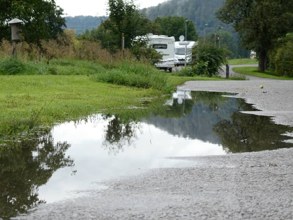 Der nächtliche starke Regen hat Spuren hinterlassen. Nicht nur Pfützen im Freien, sondern auch im Inneren des Mobis im Fahrerhaus. Es tropft von oben. Irgendwo muss eine undichte Stelle sein. Wir hatten dies auch schon früher, aber sehr selten. Aber nie konnten wir den Grund finden.