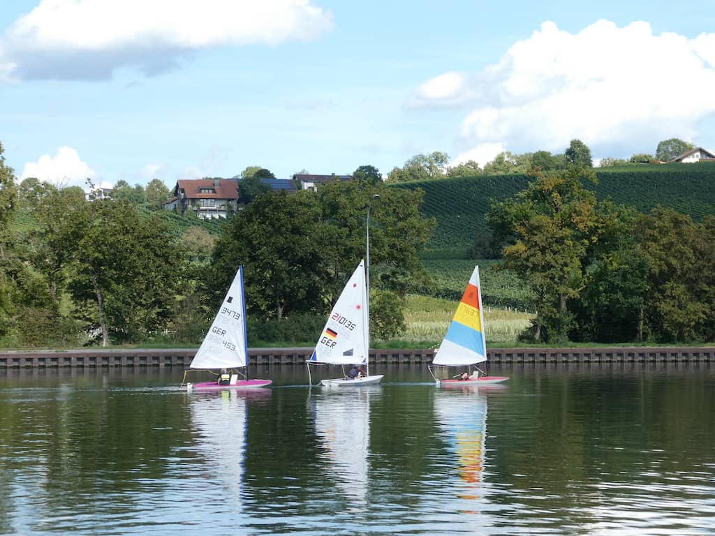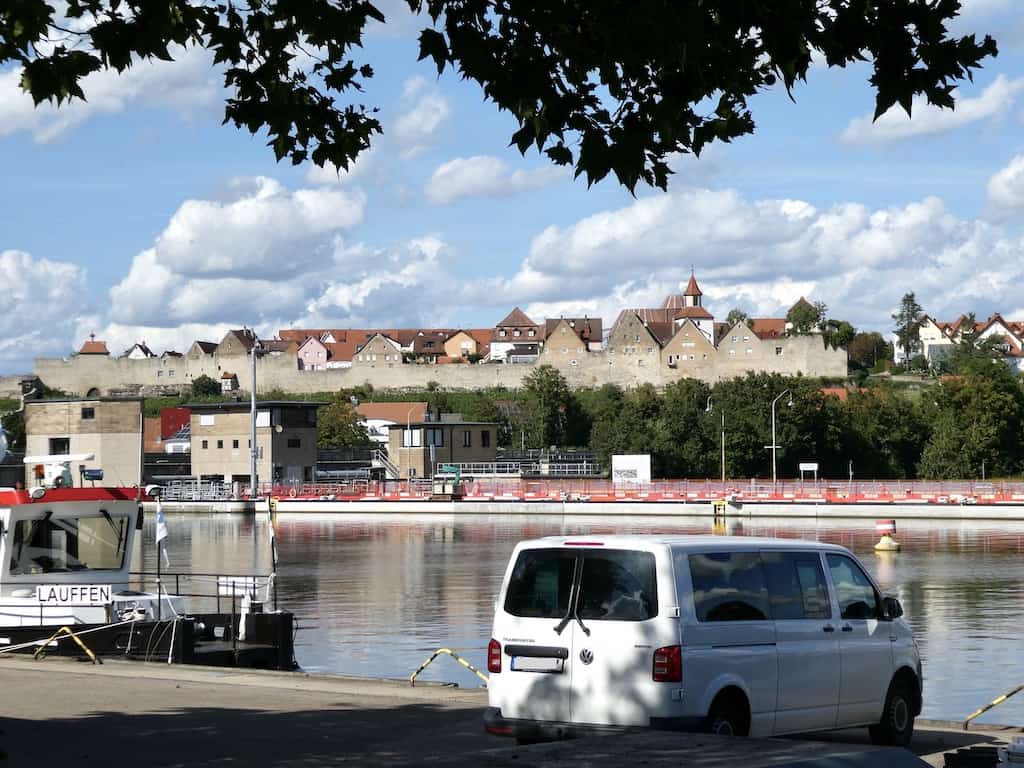 Man hat auch eine sehr schöne Aussicht auf die hübsche historische Kontur von Lauffen sowie auf den Segler-Nachwuchs.