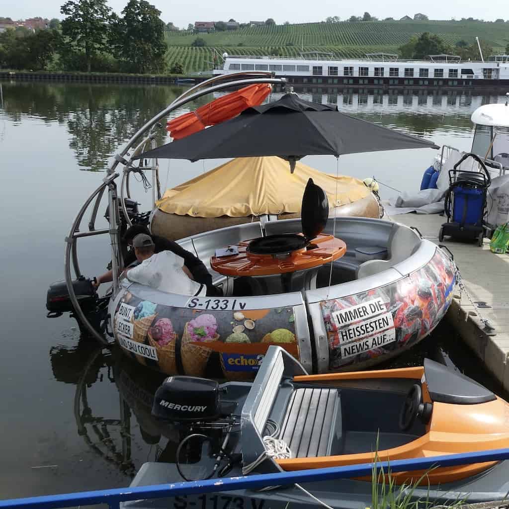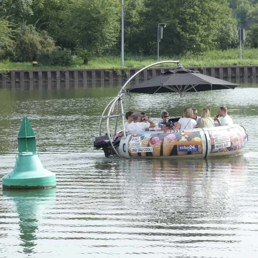Bei diesem runden Spassboot gibt es in der Mitte sogar einen brennenden Grill. Sachen gibt’s!