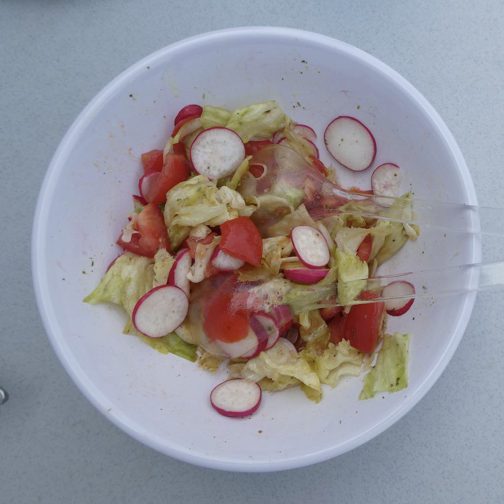 Zum Mittagessen kommt heute wieder einmal ein Stück Fleisch vom Grill und Salat auf den Tisch.