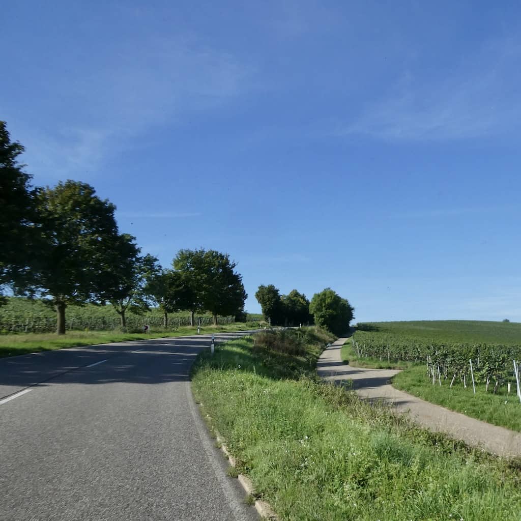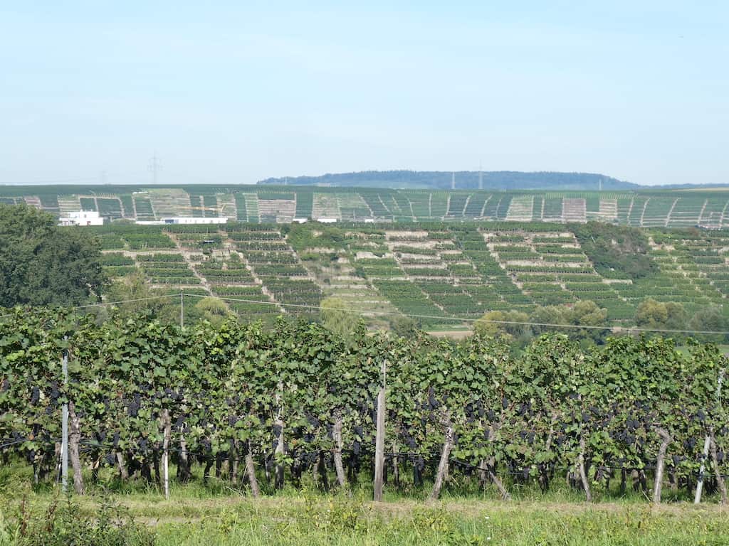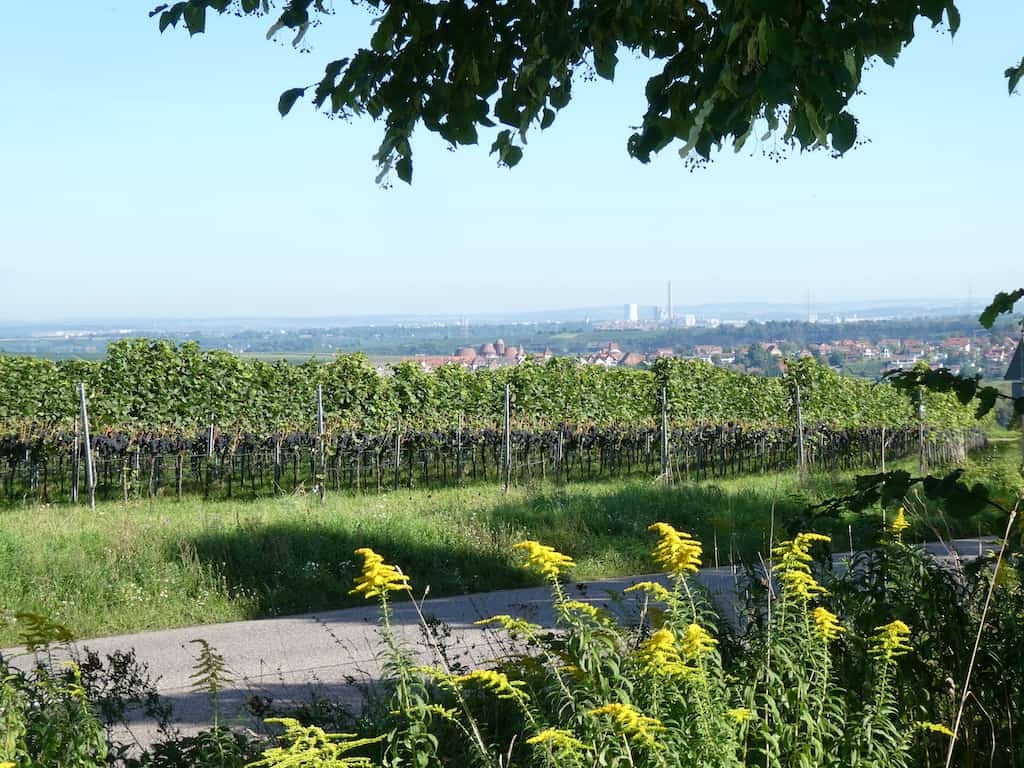 Bei der Fahrt ins Neckartal bei Lauffen dominieren die Reben.