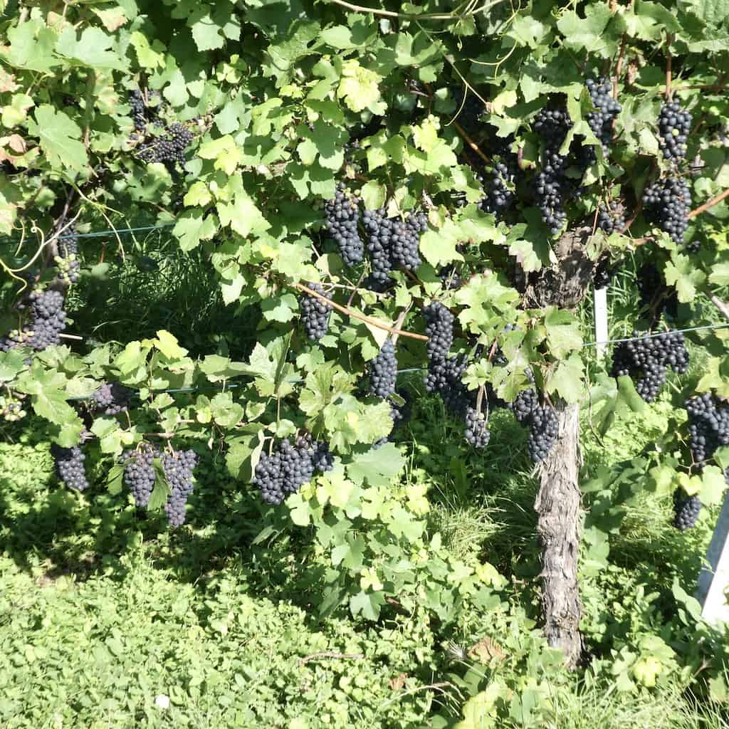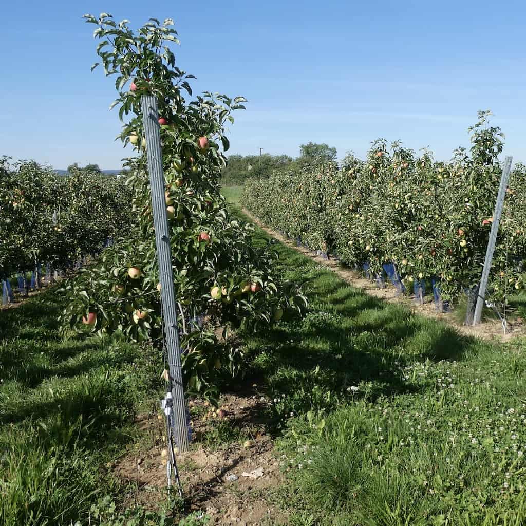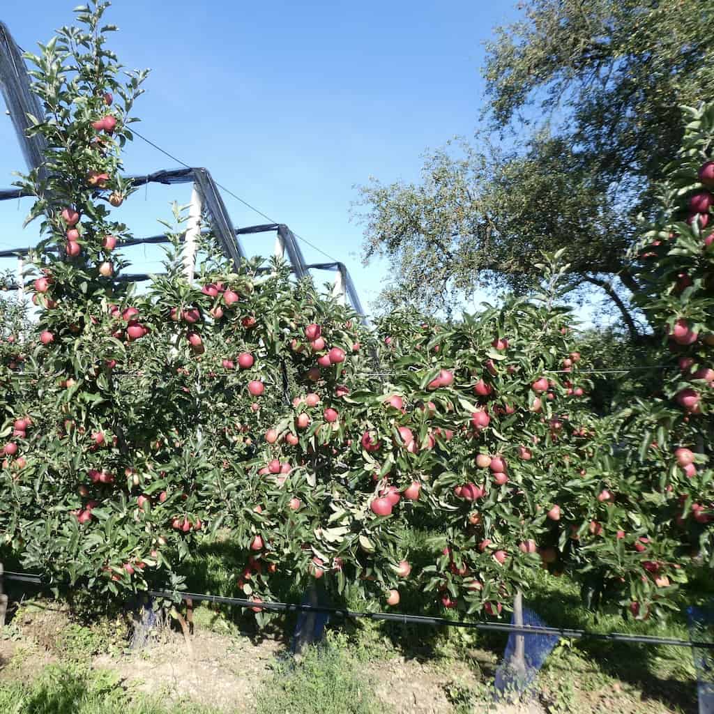 Links und rechts der Strasse wechseln sich Rebstöcke und Obstbäume ab. Es sieht nach einer guten Ernte aus.
