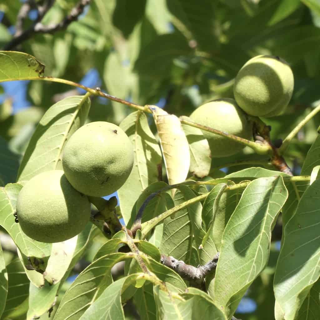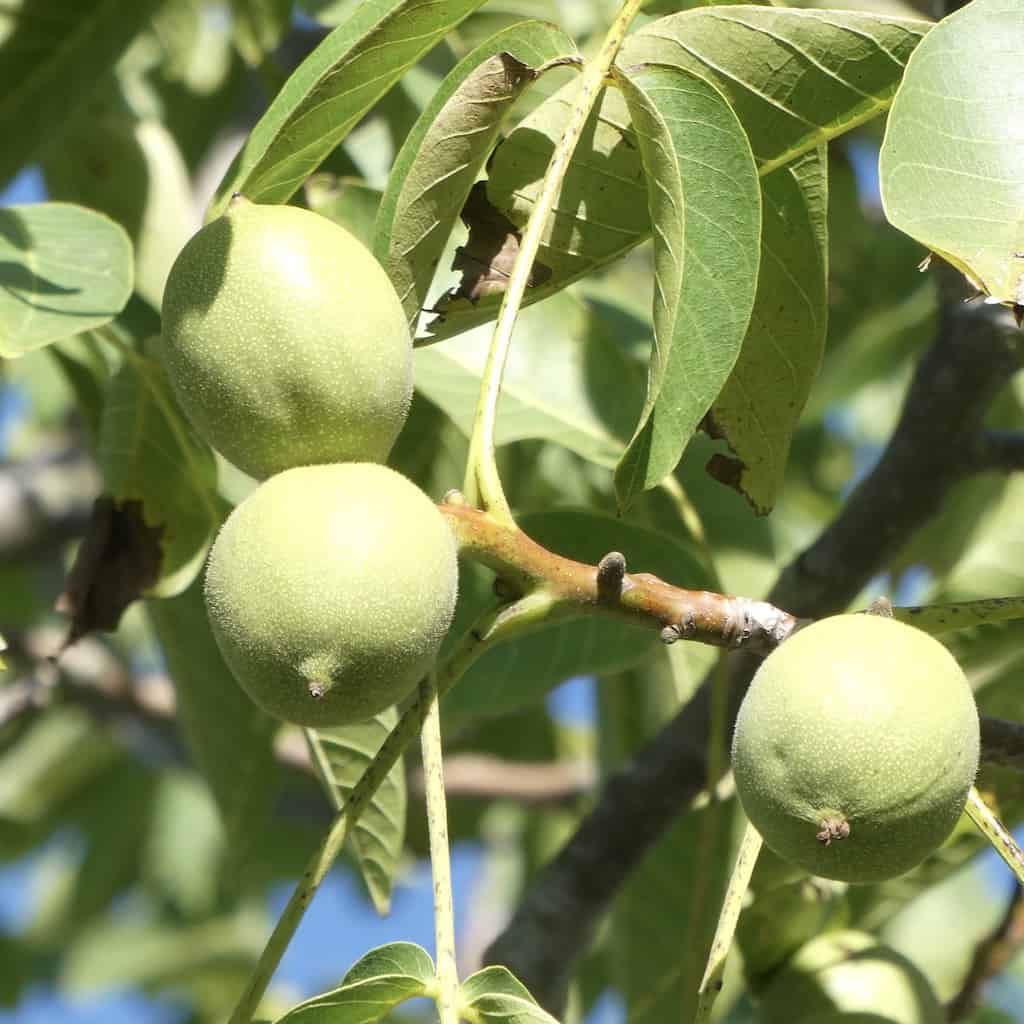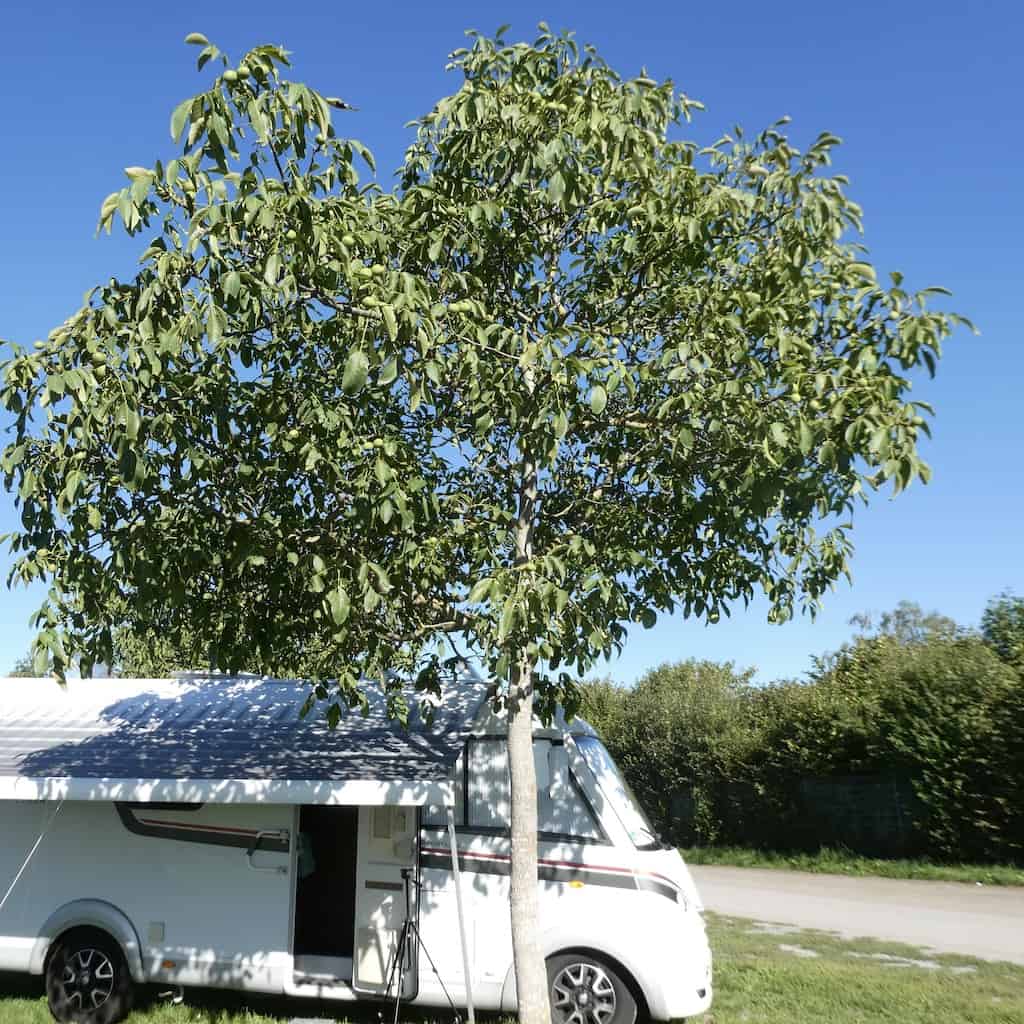 Die Nussbäume auf dem Stellplatz hängen voller Früchte.