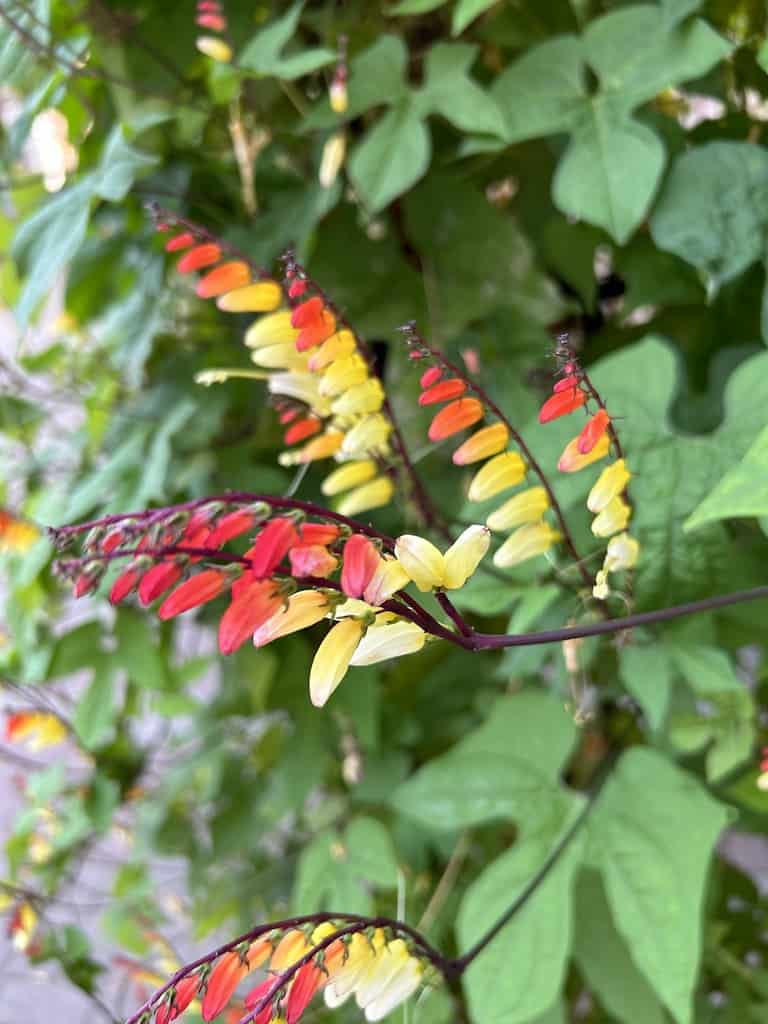 Auf dem Heimweg entdecken wir diese hübchen Ranken. Laut unserer schlauen App «PictureThis» ist dies eine Ipomoea rubriflora, eine Art der Prunkwinden.