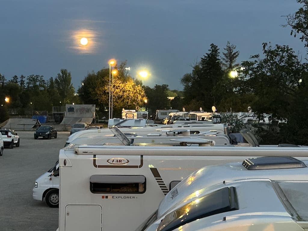 Als der Mond aufgeht (nicht zu verwechseln mit den Lampen), stehen etwa 40 Camper auf den Platz. So eng wie dies von oben aussieht, stehen wir allerdings nicht.
