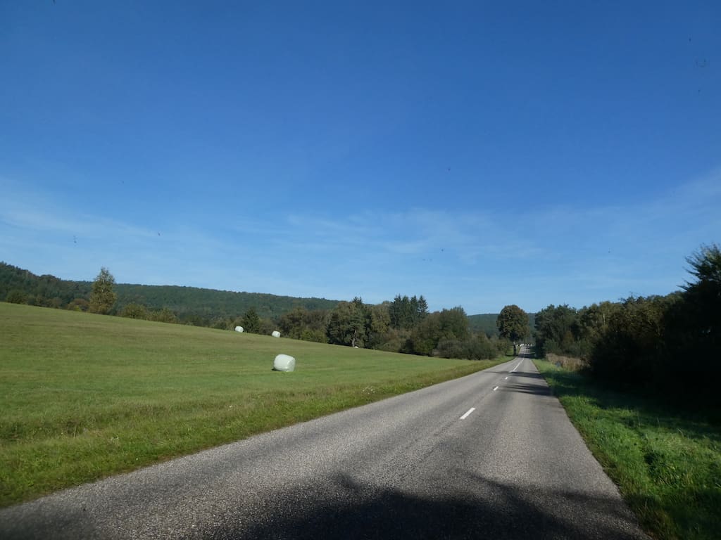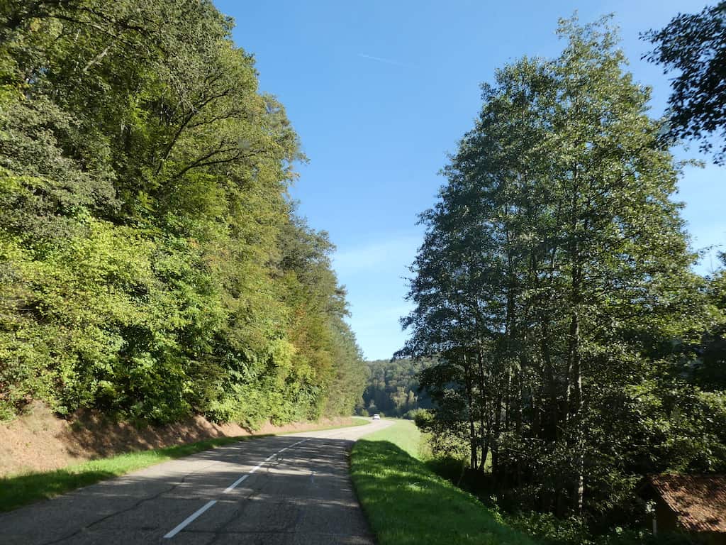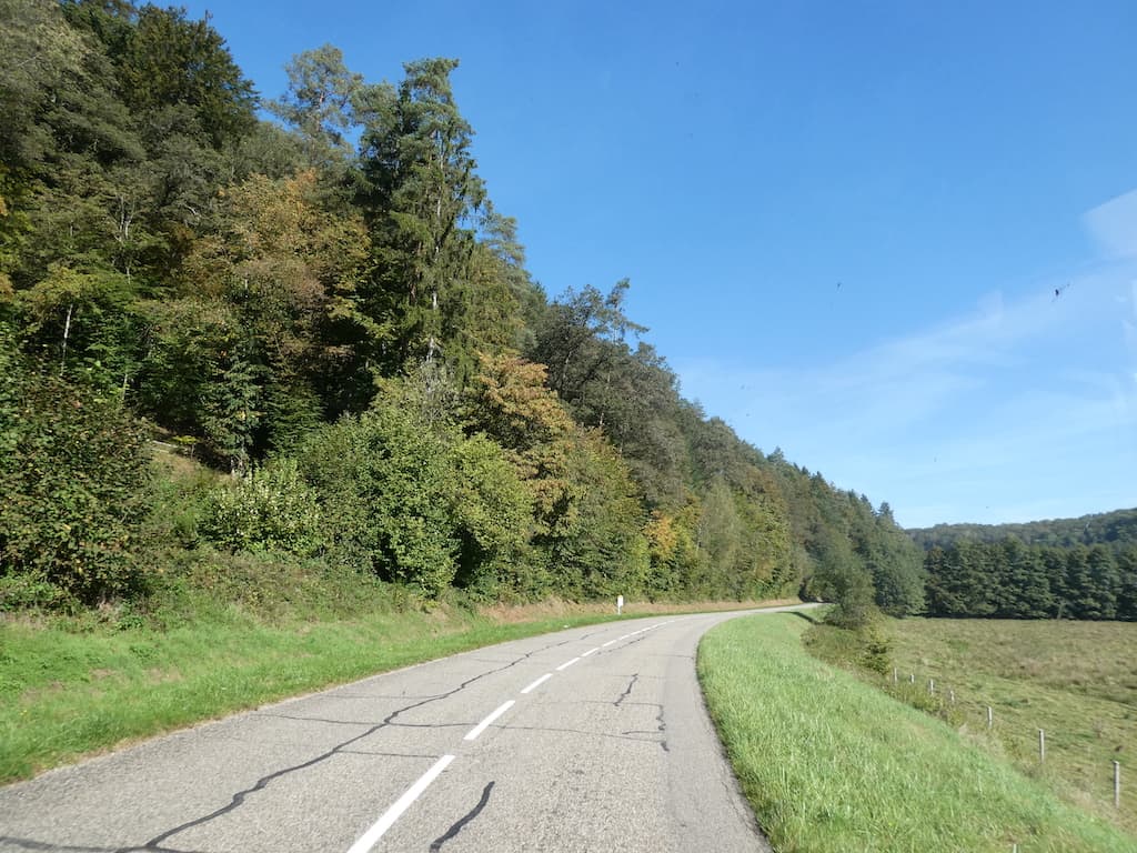 Wir wählen den Start von Eppenbrunn aus. Von Bitsch fahren wir über kleine Strassen hoch und runter. Die Landschaft ist dichtbewaldet und wunderschön. Dabei kommen wir durch ein Dorf namens Schweix.