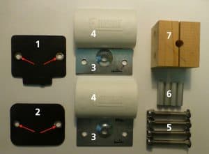 Die Teile 1 bis 5 wurden mitgeliefert. Die Distanzhülsen (6) und die Bohrhilfe (7) sind Eigenbau. Damit die Distanzhülsen nicht in die inneren und äusseren Gummiplatten eindrücken, habe ich Unterlagsscheiben eingeklebt. Die Distanzhülsen verhindern, dass sich die Aussenwand (Sandwichmaterial) beim Anziehen der Schrauben zusammenzieht.