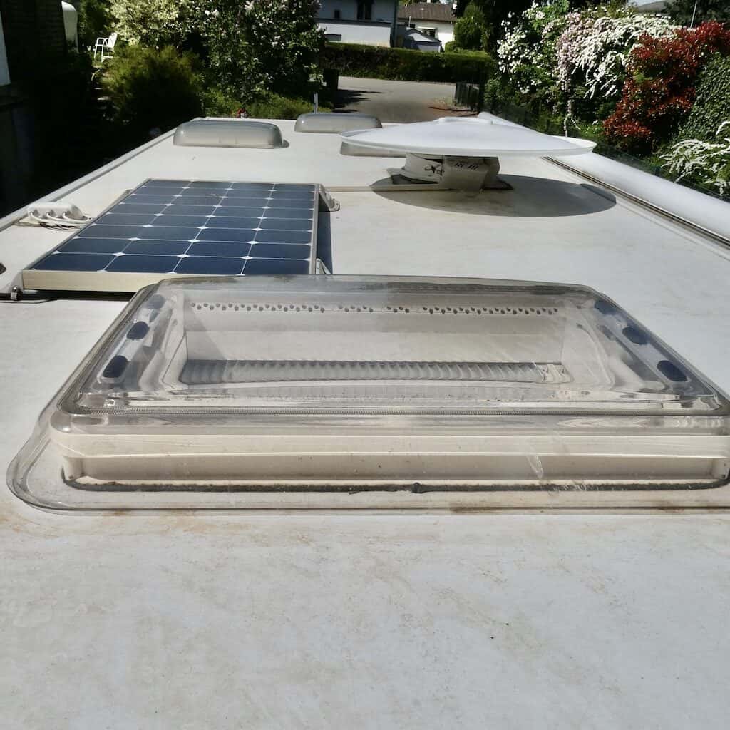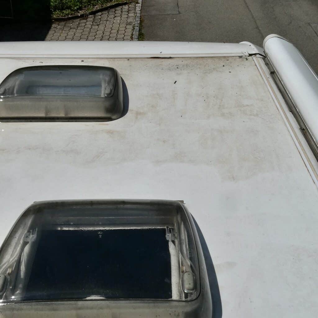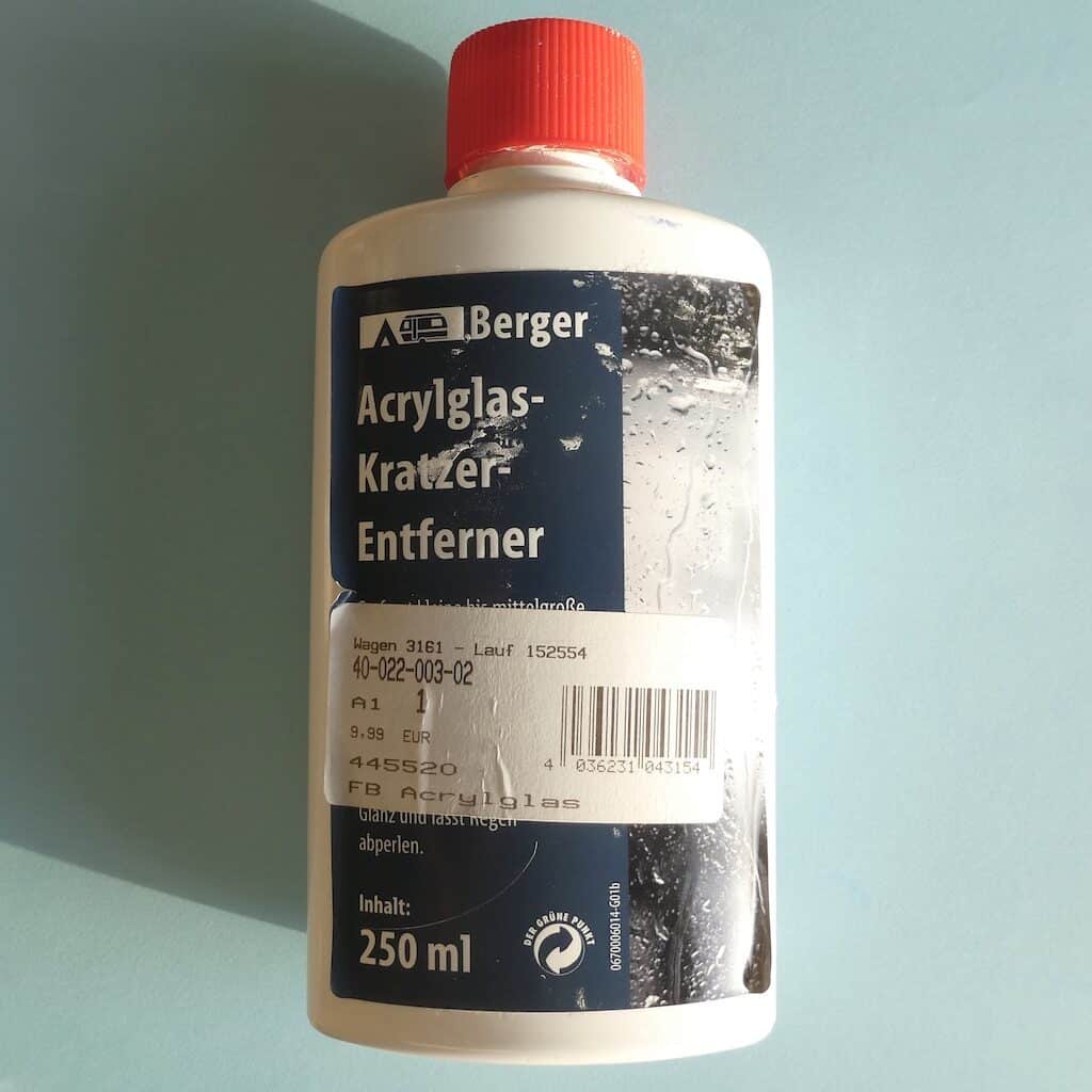 Für die Reinigung der Acrylglasfenster kam dieses spezielle Mittel zum Einsatz. Die Dachluken waren nämlich voller hartnäckiger Russ-Partikel. Entgegen der Empfehlung für einen weichen Lappen kam bei mir zum Auftragen das grobe Gewebe eines nichtkratzenden Putzschwamms zum Einsatz. Nach dem Polieren können wir nun aus dem Mobi auch den Sternenhimmel wieder ungetrübt betrachten.