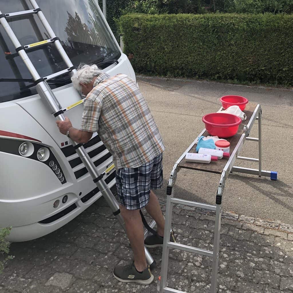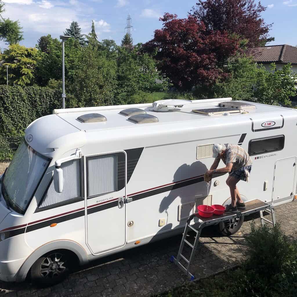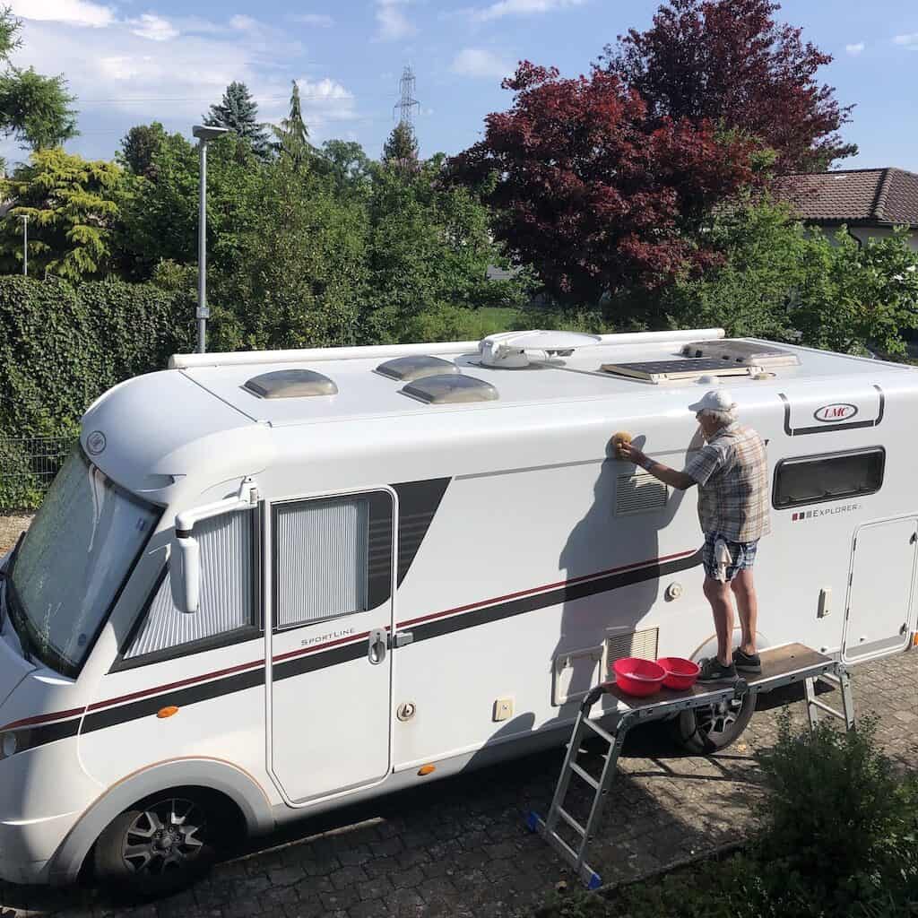 Eine automatische Waschanlage kommt wegen der Dach-Aufbauten, wie SAT-Antenne und Solarpanel und Dachluken nicht infrage. Eine Wäsche von Hand ist ohnehin viel gründlicher. Man kommt besser in die vielen Ecken und Kanten.